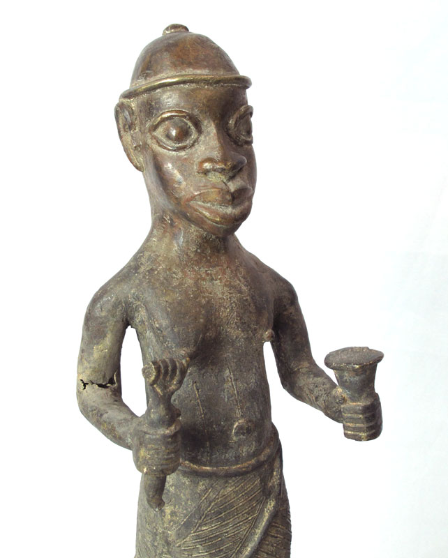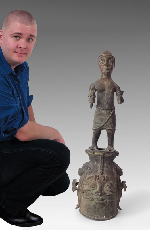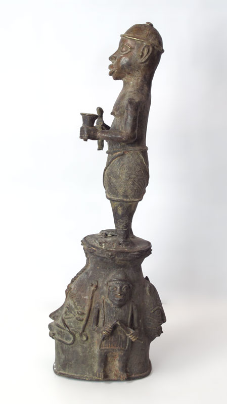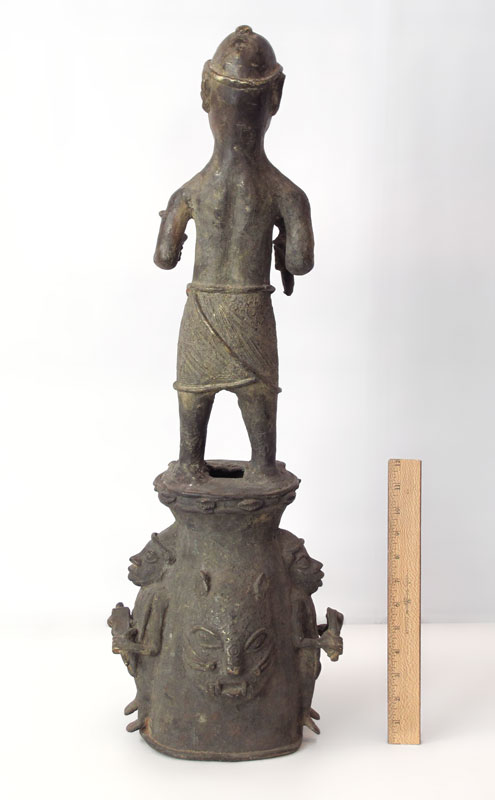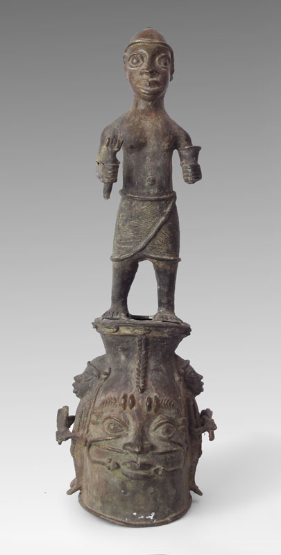 AFRICAN BRONZE FIGURE OF A HEAD SURMOUNTED BY A FULL FIGURE SCULPTURE: Approx. 30'' h. x 10'' x 11''.