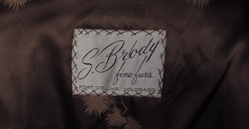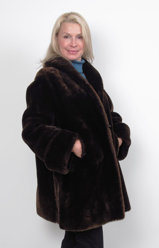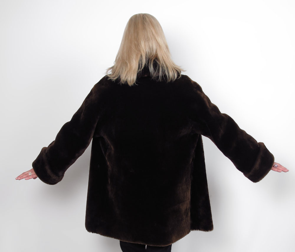 BROWN FUR COAT: Dark brown car length coat or jacket in dense thick fur, rolled cuffs. Larger size. 32''l., 24'' outside sleeve.