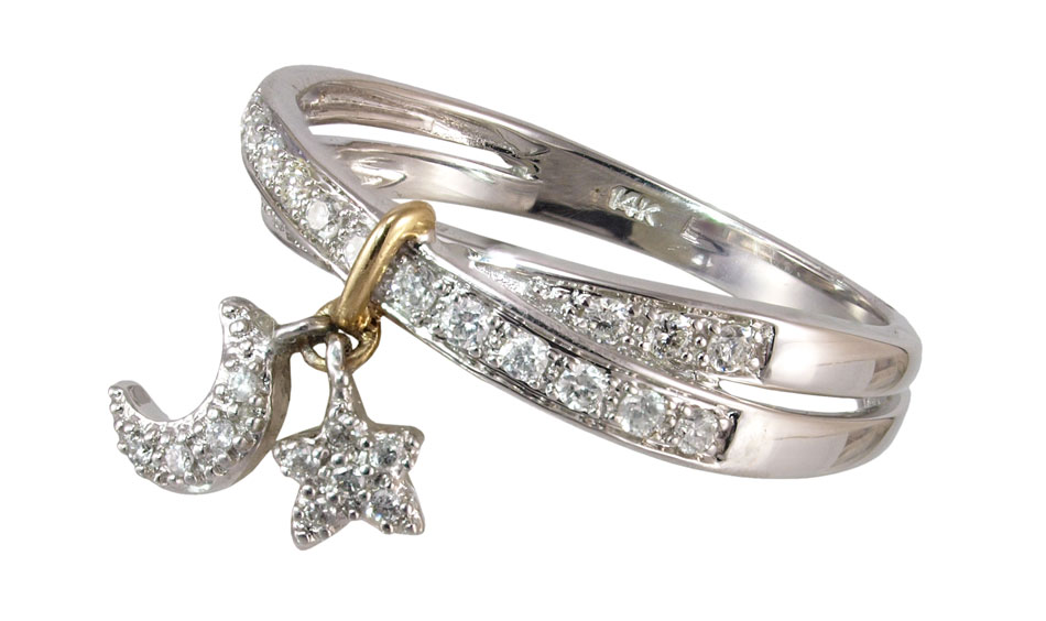 14K MOON & STAR CHARM DIAMOND RING: 14K white gold ring contains 28 round full cut diamonds. Weight: .25 Ct. Approx. Rated VS in clarity and G-H in color. The diamonds are prong set. Moon and star charms. Weight: 3.6 grams. Size: 7