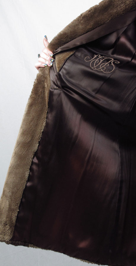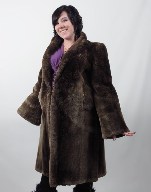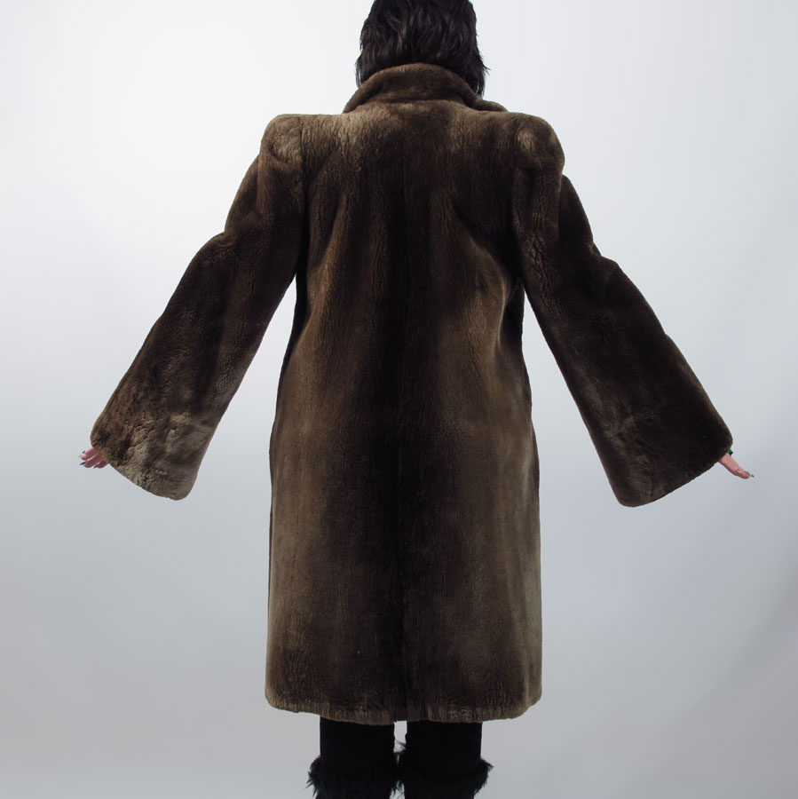 FULL LENGTH FUR COAT: Thick dense brown fur coat with long bell sleeves. Approx. 40''l., 16'' across the shoulder, 26'' outside sleeve.