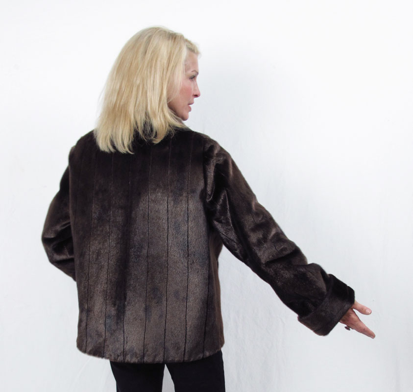 LADIES BROWN SEAL SKIN SWING COAT: Medium size jacket with rolled cuffs and slit pockets. 28'' l.