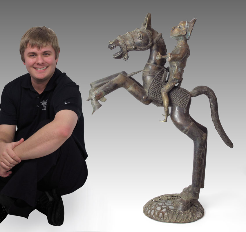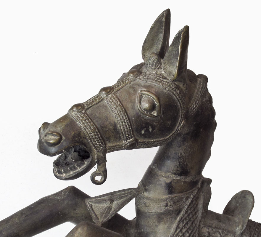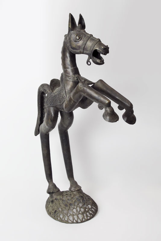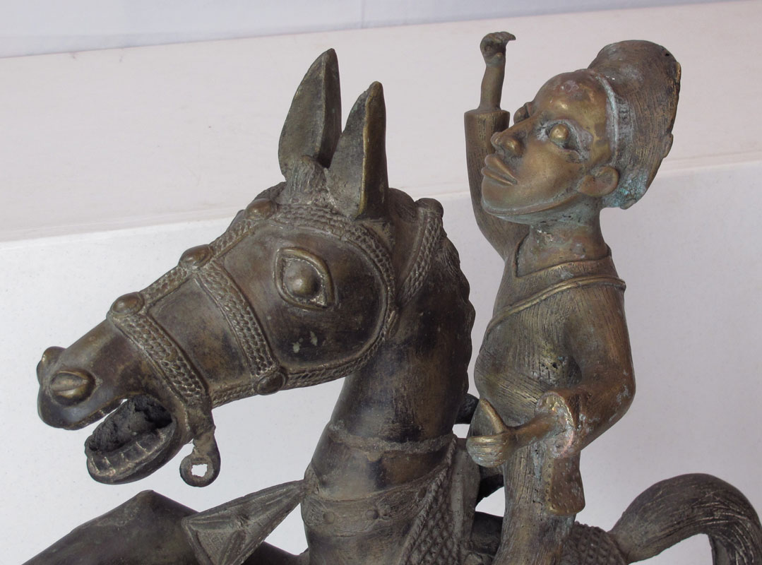 AFRICAN TIKAR FIGURE ON REARING HORSE: Approx. 40 1/2'' h. x 9 1/2'' x 29''.