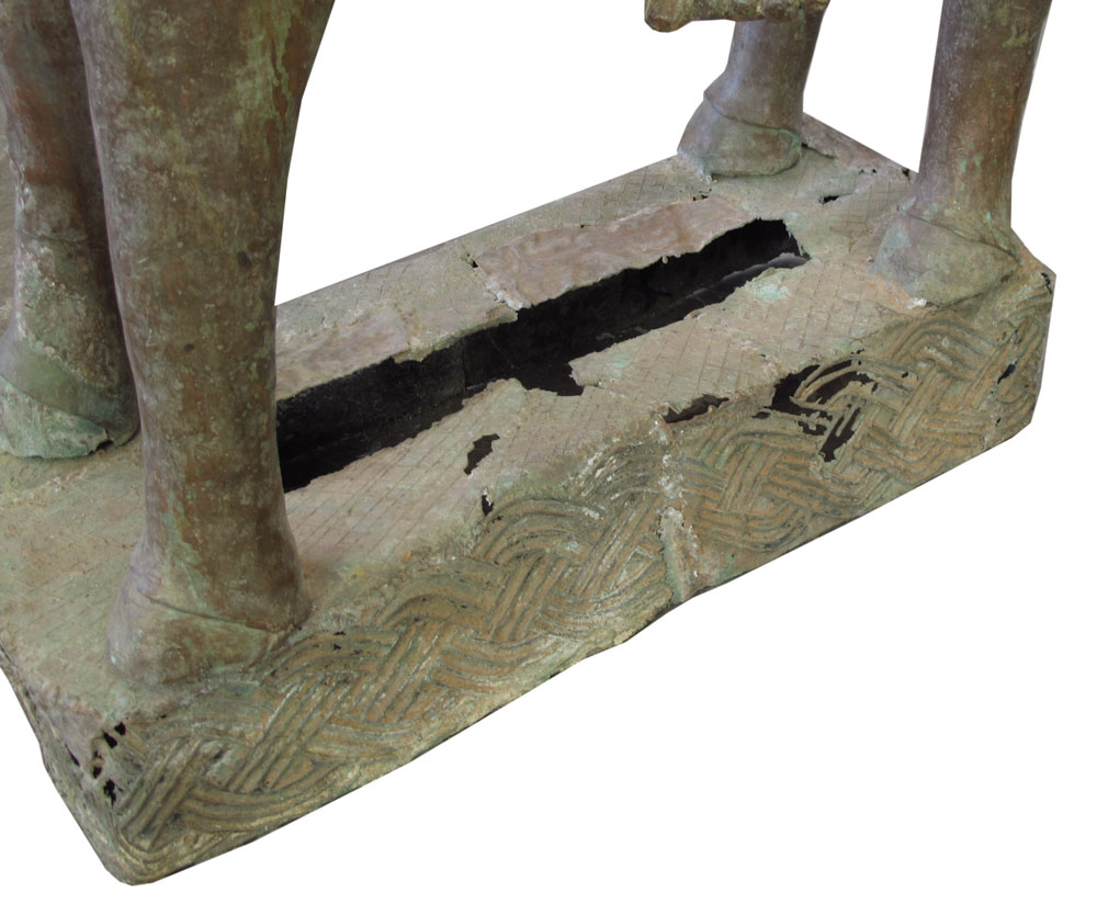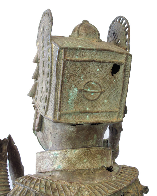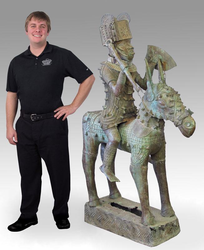 LARGE BENIN AFRICAN BRONZE WARRIOR ON HORSE SCULPTURE: 5' 4'' h. x 1' 8'' x 3' 2''