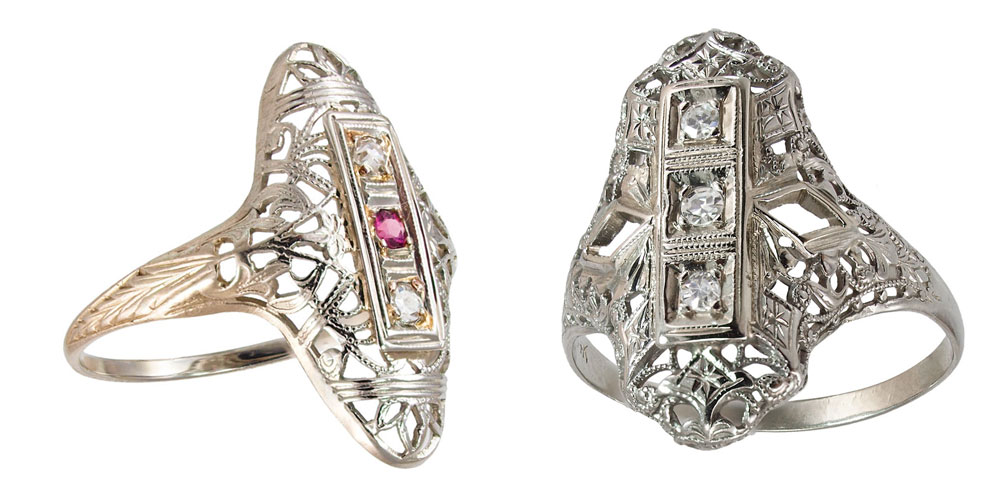 TWO GOLD FILIGREE RINGS: 1) 18K white gold filigree ring with ruby contains 2 round single cut diamonds. Weight: .03 Ct. Approx. Rated VS in clarity and G-H in color. One round ruby. Weight: .03 Ct. The diamonds and ruby are prong set. Weight: 2.3 grams. Size: 7. 2) 14K white gold filigree ring contains 3 round single cut diamonds. Weight: .08 Ct. Approx. Rated VS in clarity and G-H in color. The diamonds are prong set. Weight: 2.7 grams. Size: 8.5