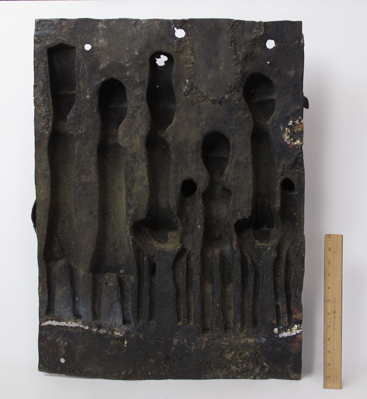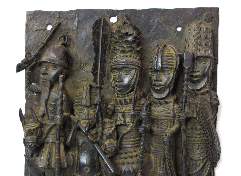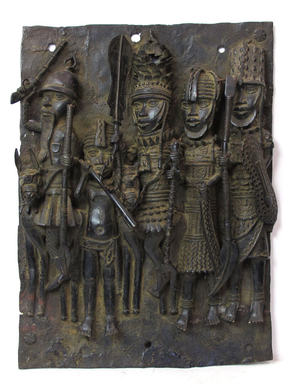 BENIN AFRICAN BRONZE PLAQUES SCULPTURE: Depicting five warriors and a horse. Approx. 2' 6'' x 1' 9'' x 5''