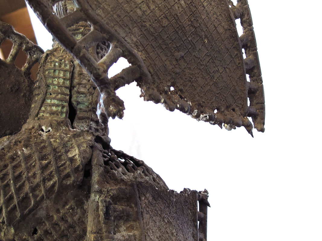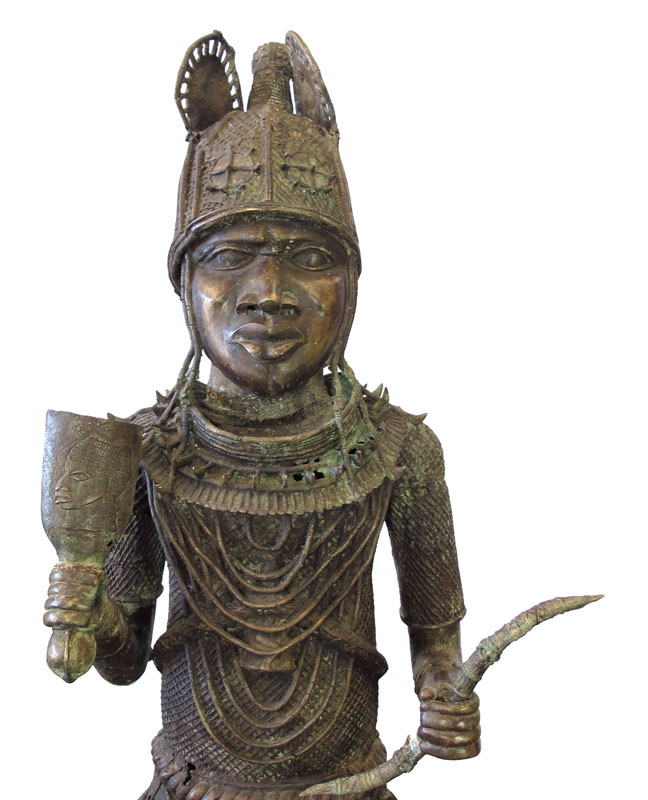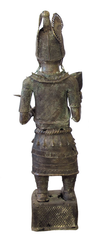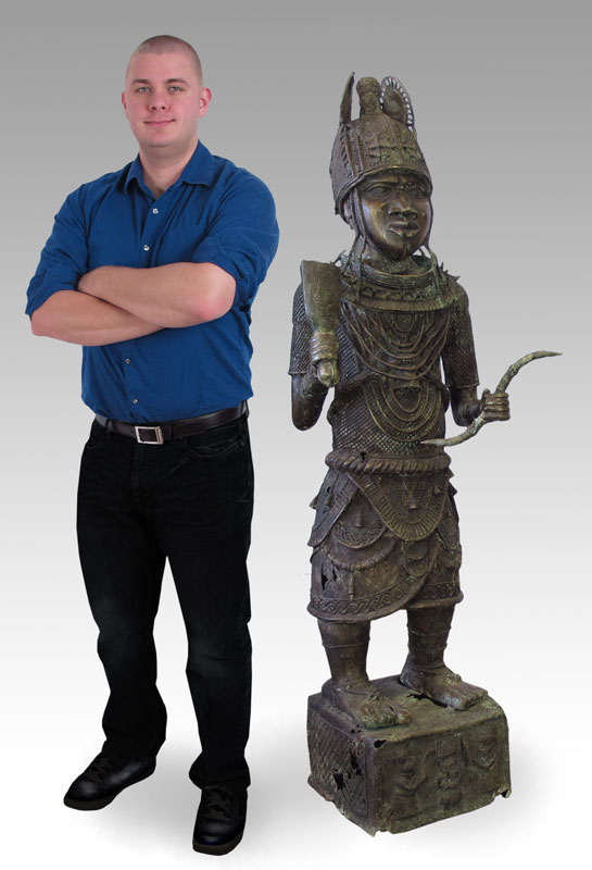 LIFE SIZE BENIN AFRICAN CAST METAL WARRIOR SCULPTURE: 5' 4'' x 1' 10'' x 14''.