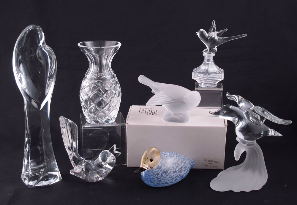7 PIECE CRYSTAL FIGURINE COLLECTION: To include Lalique, Waterford, Steuben, Italian Murano Art Glass Ducks, etc. Tallest piece measures 10 1/2'' h.