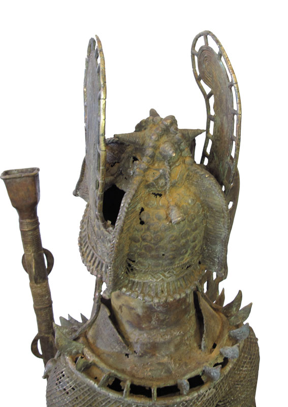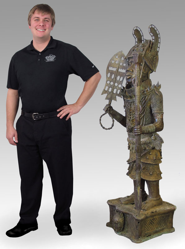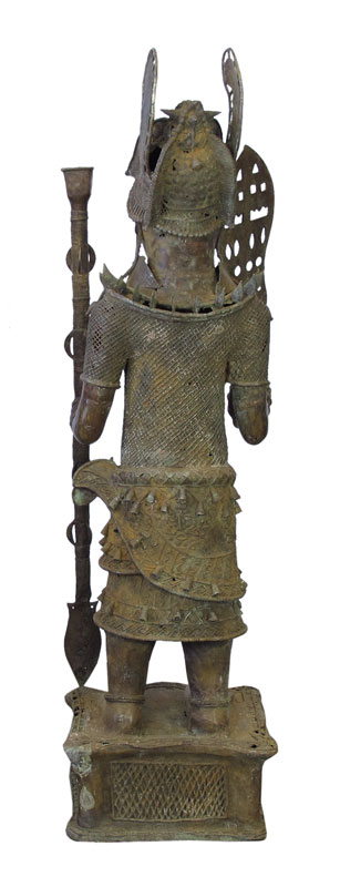 LARGE BENIN BRONZE WARRIOR SCULPTURE: Pedestal decorated with leopard heads. Approx. 5 1/2' x 16'' x 18''.
