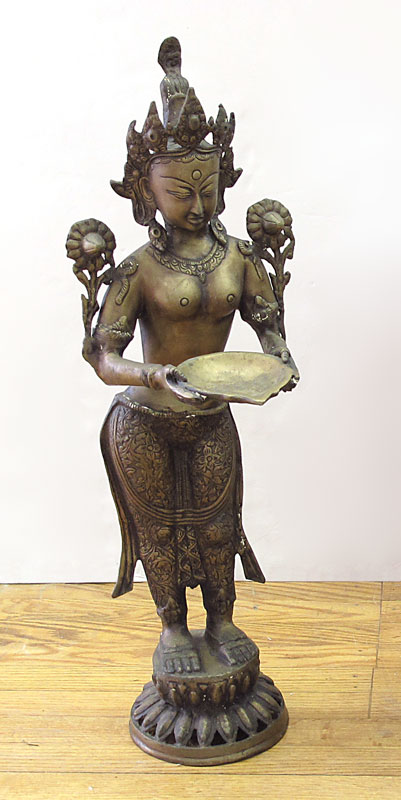 THAI BUDDHIST BRONZE DEITY SCULPTURE: Buddhist deity holding offering plate. 29 1/2'' h. x 10'' x 9 3/4''.