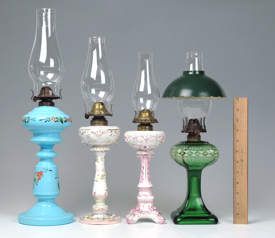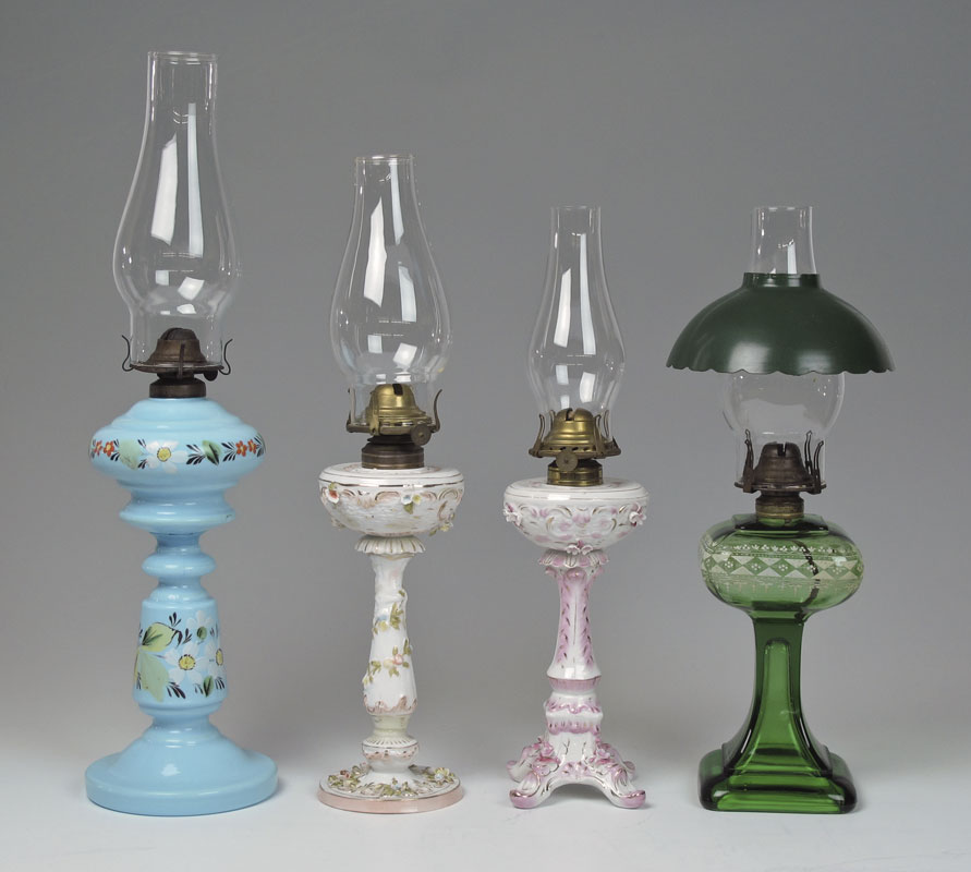 GROUP OF 4 OIL LAMPS: Two Dresden type porcelain lamps, and two hand painted glass. The porcelain lamps have ABCO thumbwheels. Approx. 10-13'' excluding the chimneys.