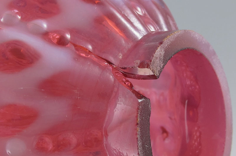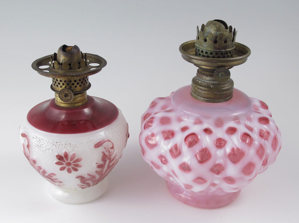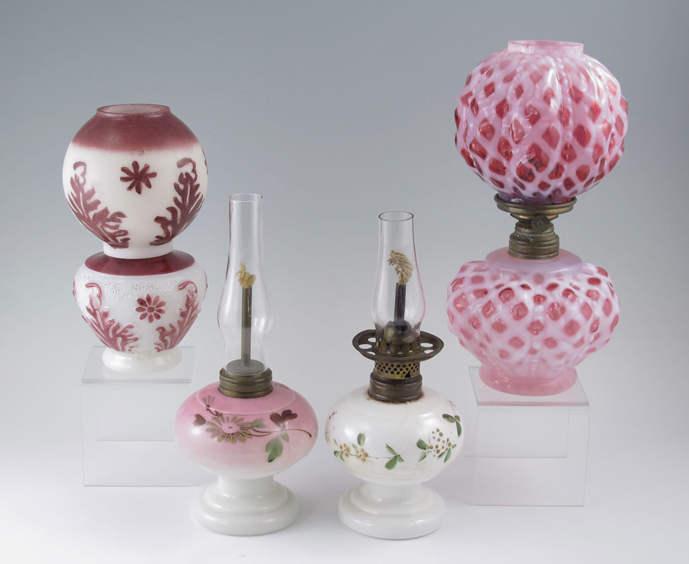 GROUP OF 4 MINIATURE OIL LAMPS: One cranberry opalescent (chip on bottom rim of shade) and three hand painted milk glass. 7.5'' - 10''.