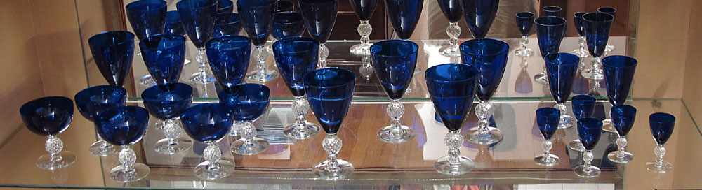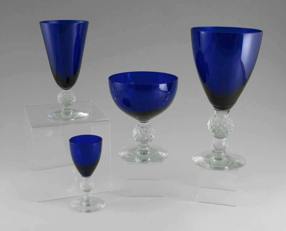 VINTAGE MORGANTOWN GLASS COBALT GOLF BALL STEMS: 21 pieces to include 8 water (6 3/4'' h. x 3 1/2''), 6 sherberts (4 1/4'' x 3 5/8''), 5 cordials (3 1/2'' x 1 5/8''), 2 juice (5'' h. x 2 1/2'').