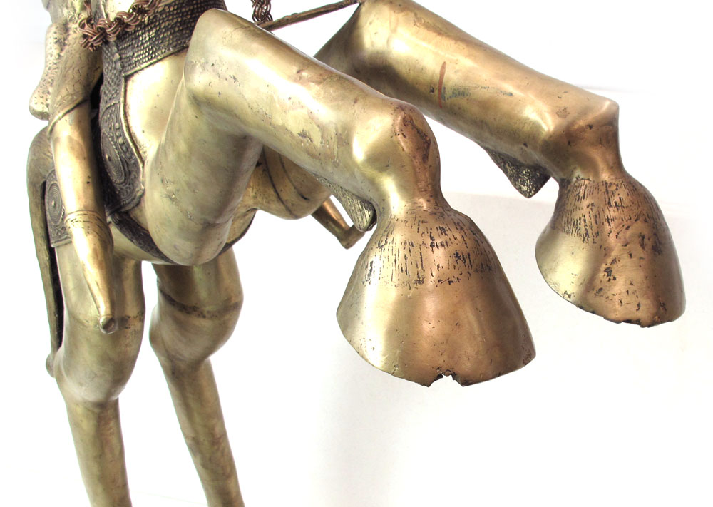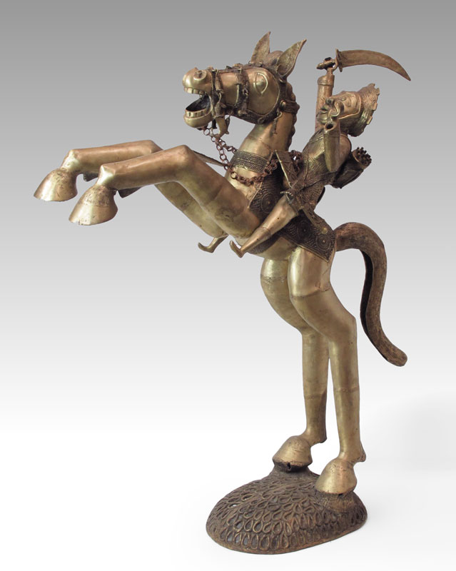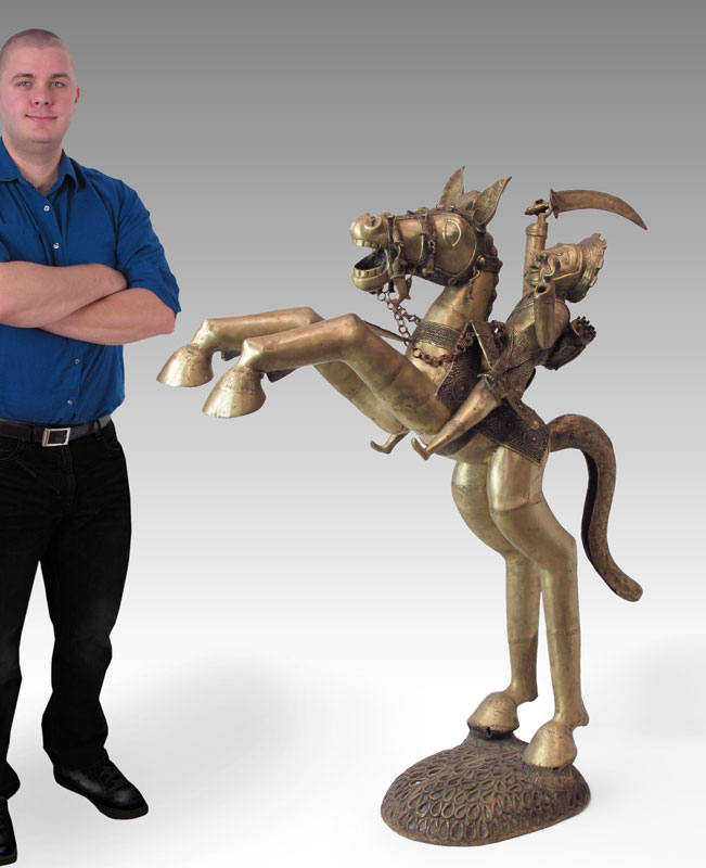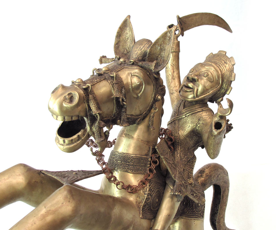 TIKAR AFRICAN BRASS / BRONZE REARING HORSE AND RIDER SCULPTURE: Later 20th C. Approx. 58''h. x 51'' x 19''