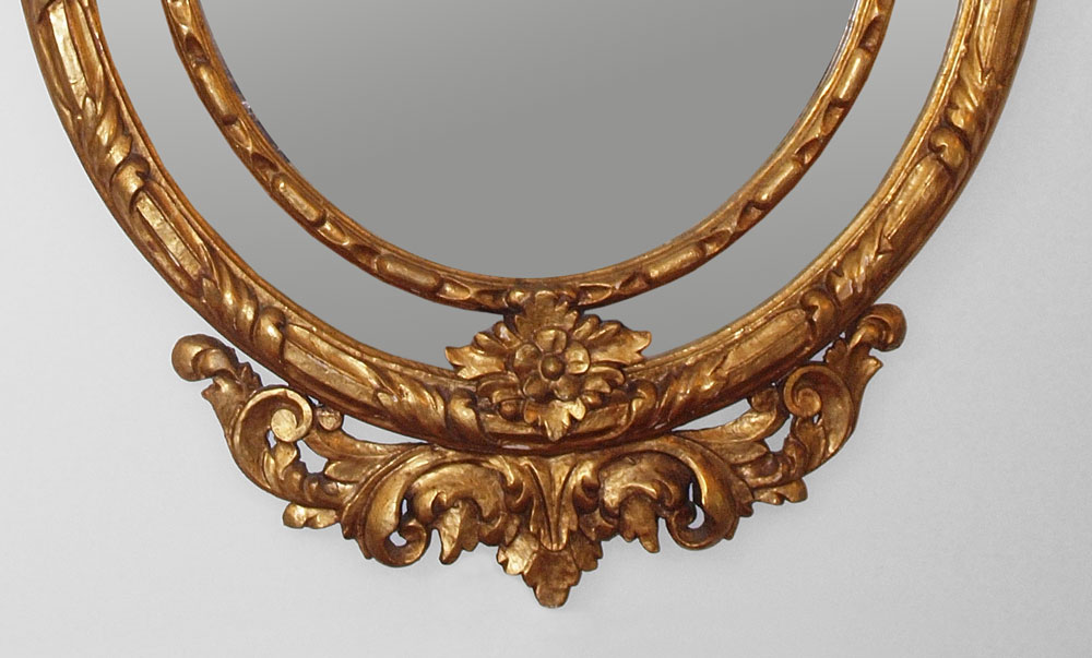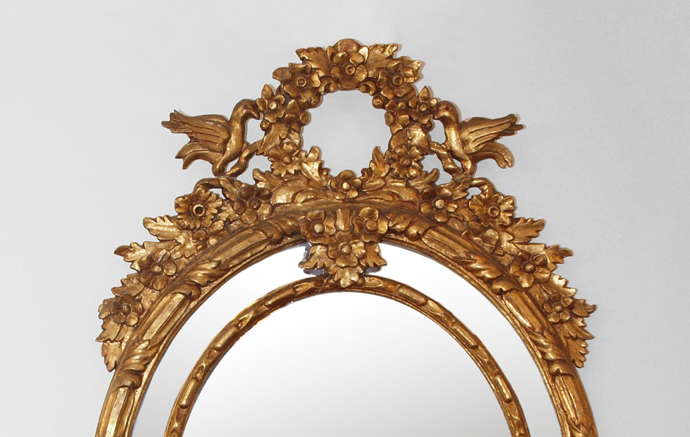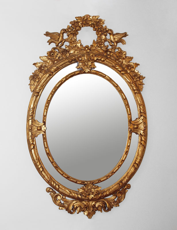 ORNATE ITALIAN GILT WOOD MIRROR: Carved gilt wood mirror surmounted by two birds joined by a wreath over a floral swag. Measures approx. 63'' tall x 39''w.