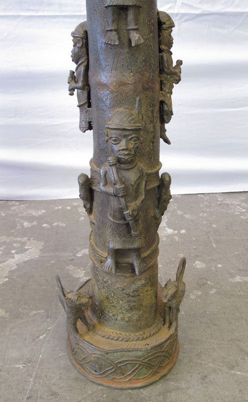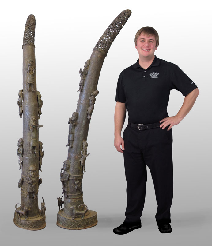 PAIR BENIN AFRICAN BRONZE ALTAR TUSKS SCULPTURE: Approx. 72 1/2'' x 11'' x 20'' each.