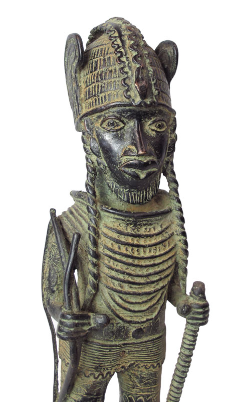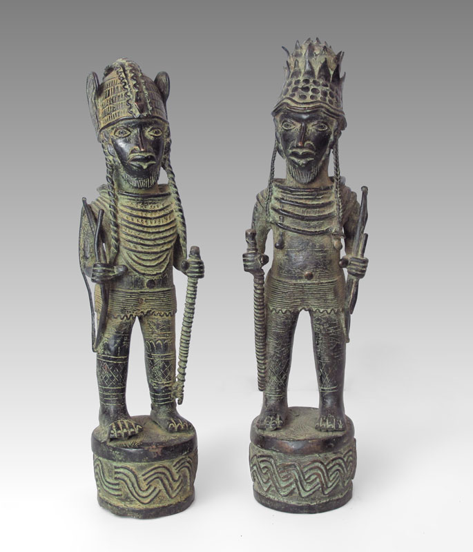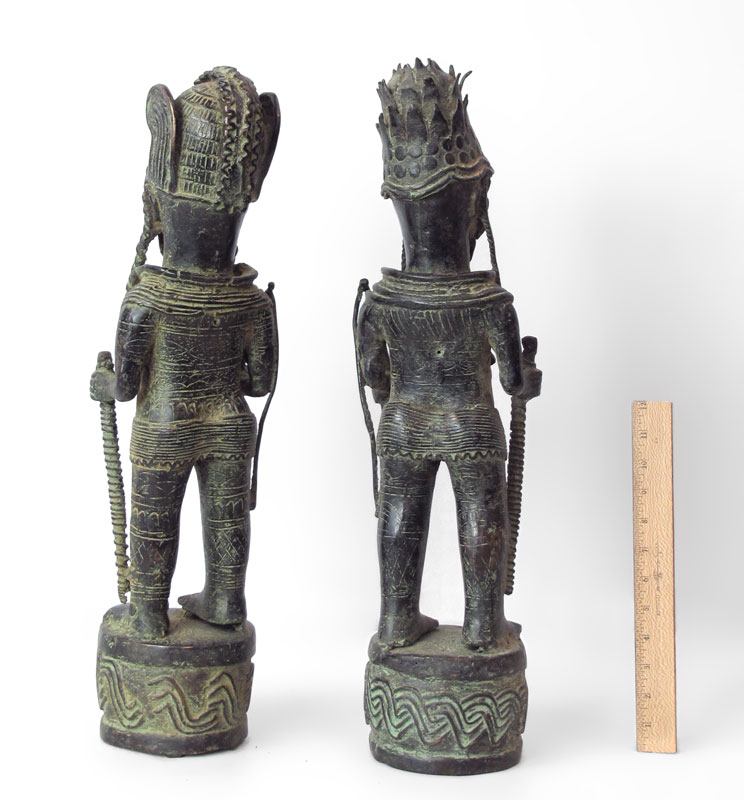 TWO AFRICAN TRIBAL CHIEFTAIN BRONZE FIGURES SCULPTURE: Approx. 20 1/2'' h. x 7 1/2'' x 5 1/2''.