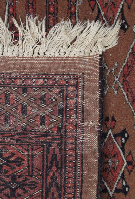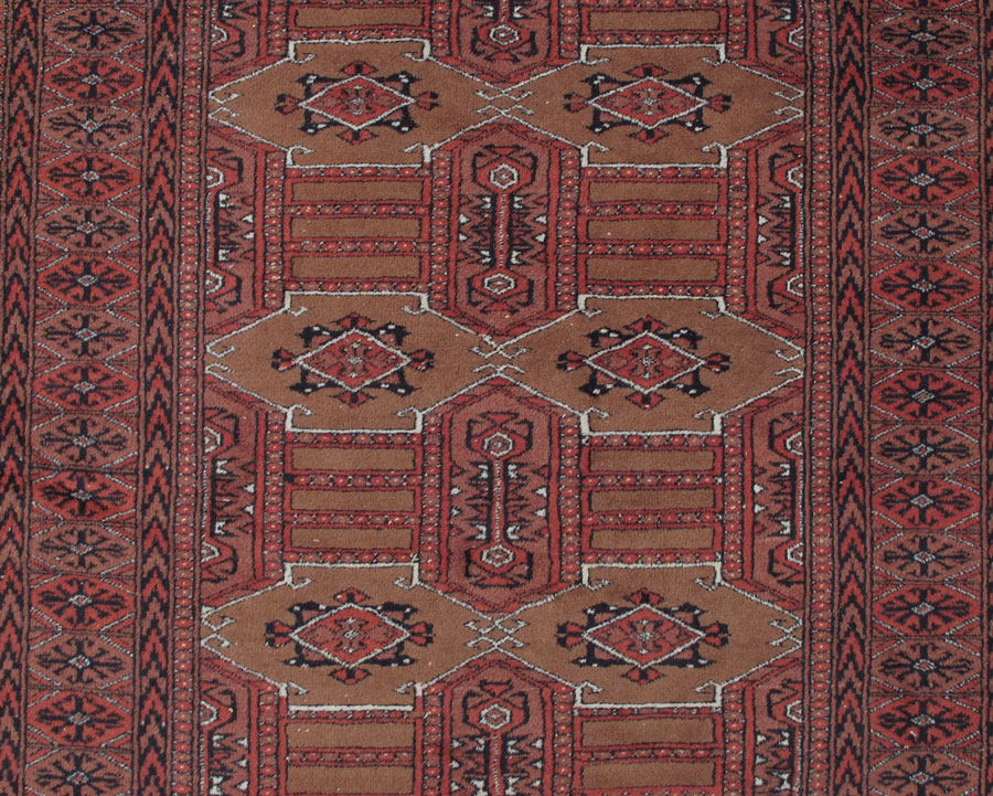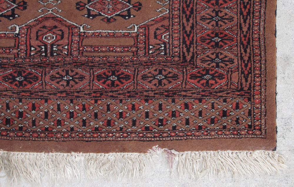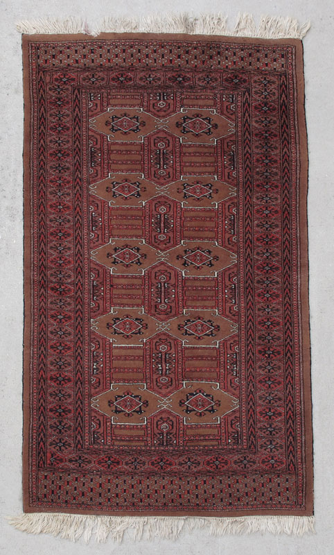 MODERN PAK BOKHARA HAND KNOTTED WOOL RUG, 3' 3 1/2'' x 5' 2 1/2'': This is another variant on a Bokhara with rusts, black, and white on a cinnamon field. The geometric designs in the center give the effect of panel work over the field. The borders are more typical with many small borders completing the rug. Condition is good.