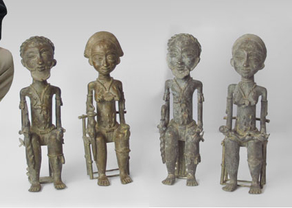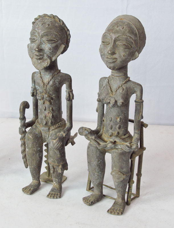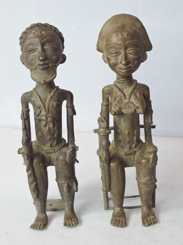 TWO SETS OF AFRICAN BRONZE CHIEF AND QUEEN IN THEIR CHAIRS SCULPTURE: One set measures approx. 15''tall. The second set 14'' tall.