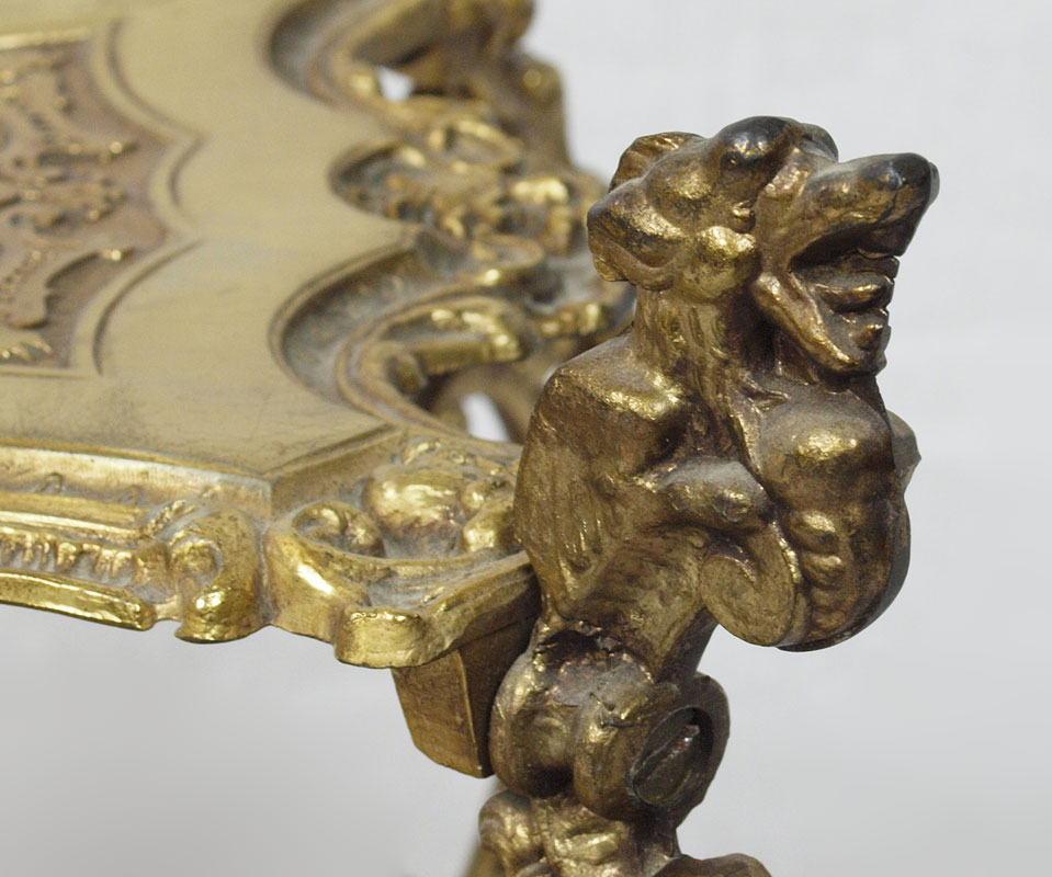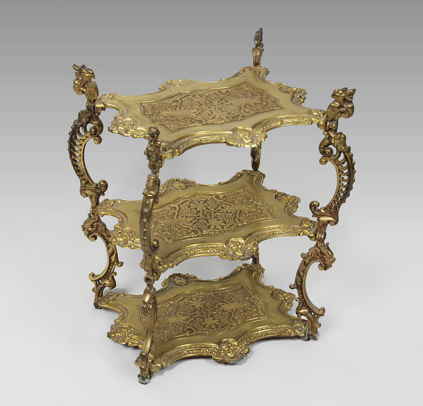 3 TIER GILT METAL FIGURAL STAND: 3 cast tiers featuring masquerons and putti heads, foliate scroll supports with figural dragon finials. Measures 22 1/2'' h. x 18'' x 14 1/2''.