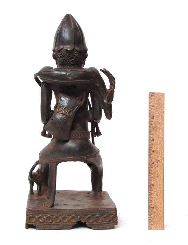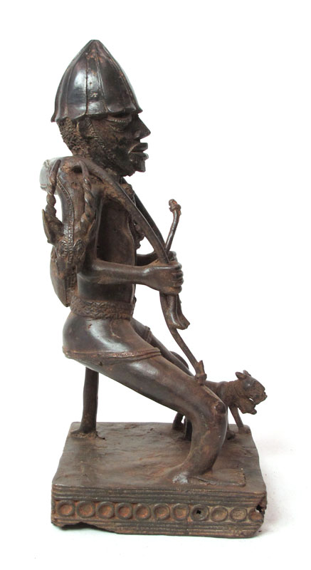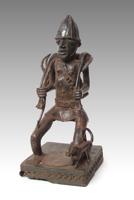 BENIN AFRICAN BRONZE HUNTER WITH DOG SCULPTURE: 19'' h. x 8 1/2'' x 9''.