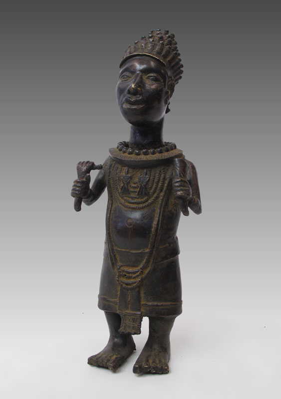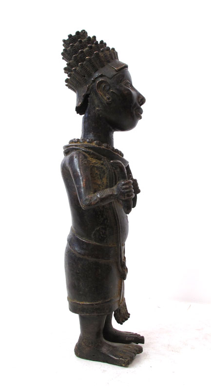 BENIN AFRICAN BRONZE SHAMAN ALTAR FIGURE SCULPTURE, 21'' x 7'' x 5''