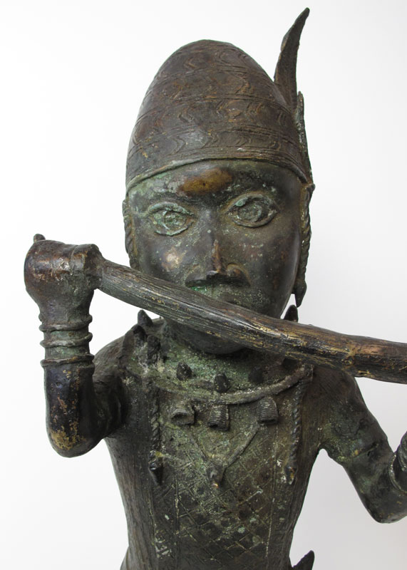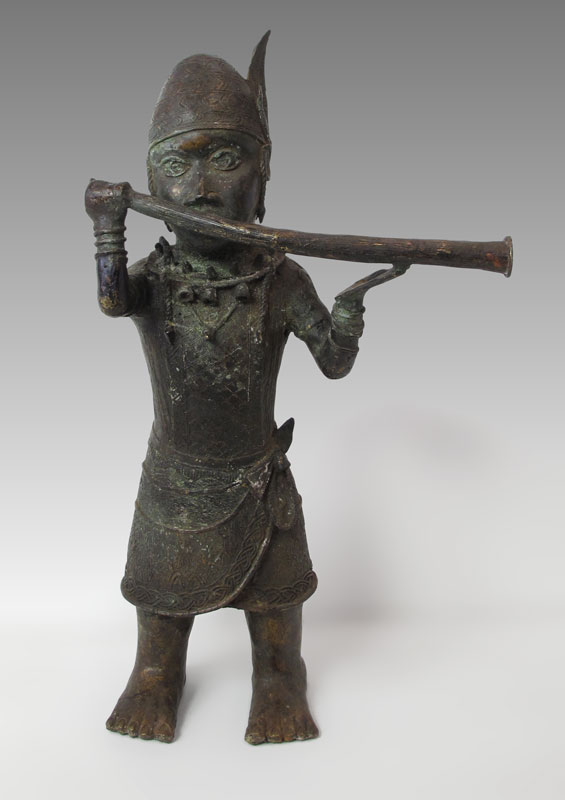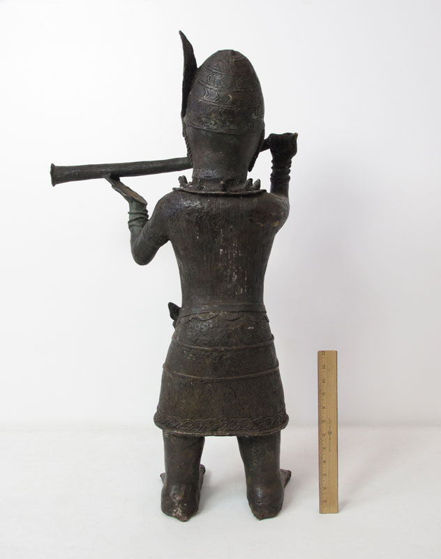 BENIN AFRICAN FIGURE WITH FLUTE INSTRUMENT SCULPTURE: 3' h. x 1' 7'' x 9''.