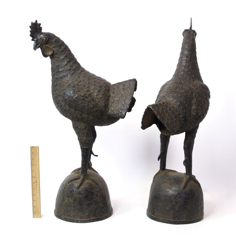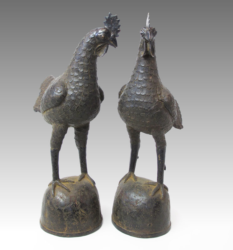 TWO AFRICAN BRONZE CAST METAL ROOSTERS SCULPTURE: one measures 2' 9'' h. x 8 1/2'' x 14'', other 2' 8 1/2'' h. x 10 1/2'' x 17''.