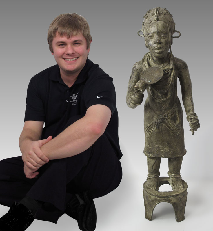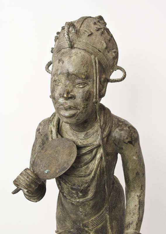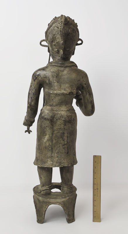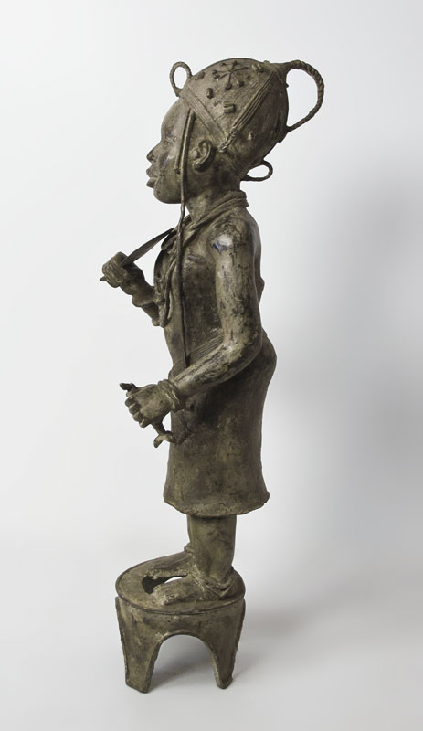 BENIN AFRICAN BRONZE FIGURE ON OPEN PLATFORM SCULPTURE: 3' h. x 12 1/4'' x 1''.
