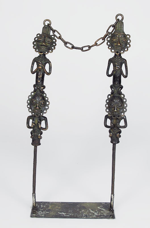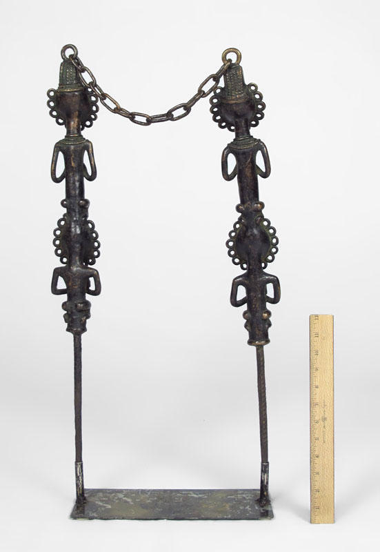 TWO BRONZE FIGURAL SPEAR TOTEMS SCULPTURE: Each connected to other by chain. With stand. 28 1/4'' h. x 13 1/2'' x 5''.