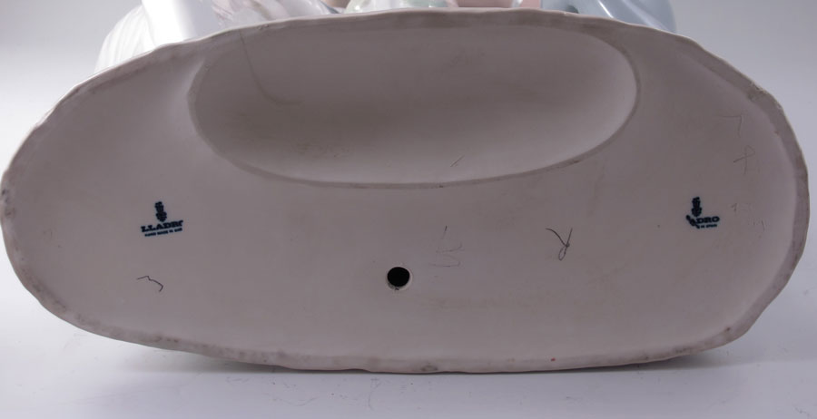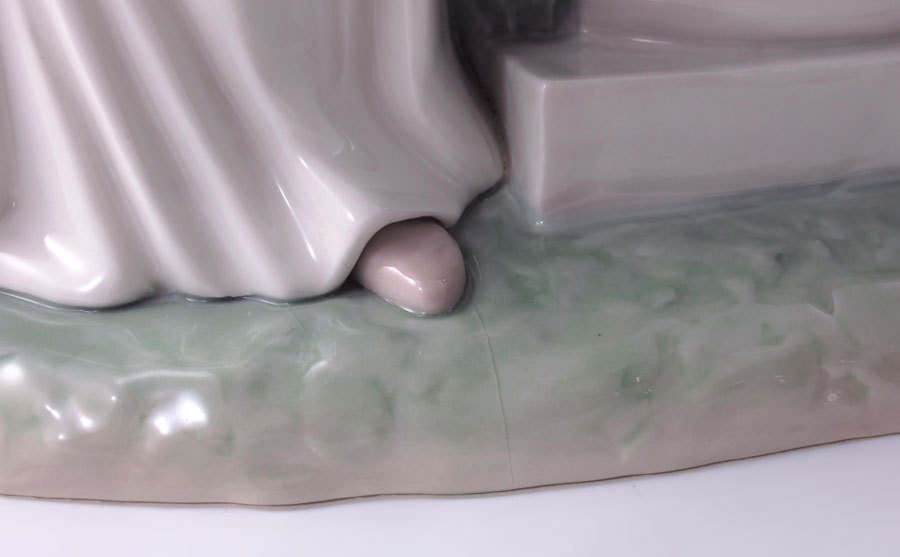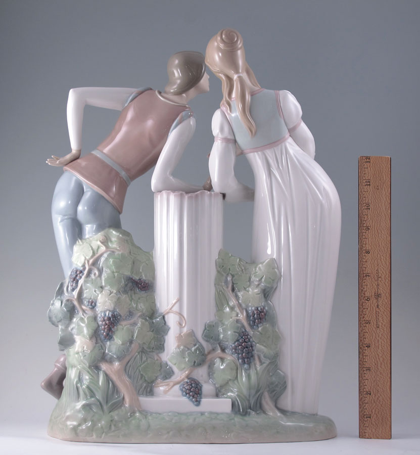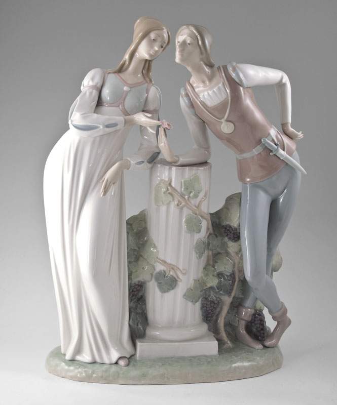 LLADRO PORCELAIN FIGURINE, ROMEO AND JULIET: #4750, Alfredo Ruiz sculptor, issued 1971 retired 2005, 17 3/4''h. x 13'', flower in his hand has been reattached, small crack at top of column and at base by juliet's foot, with original box, 10'' x 18'' x 22''.