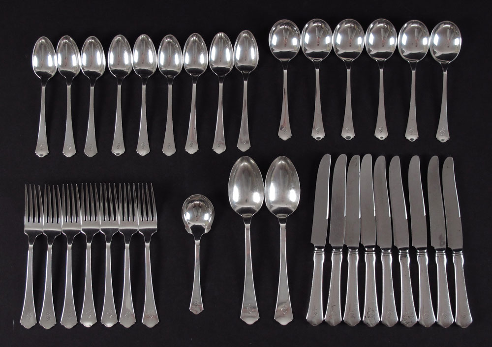 34 PIECE WALLACE ''ANTIQUE'' STERLING SILVER FLATWARE: Approx. 34 pieces in the Antique pattern by Wallace Silver to include 7 forks (7''), 9 teaspoons (5 7/8), 6 soup spoons (5 7/8''), 9 hollow knives (8 3/8''), 2 tablespoons (8 1/4''), sugar scoop (5 7/8''). Monogrammed ''S''. Approx. 35.7 troy oz.