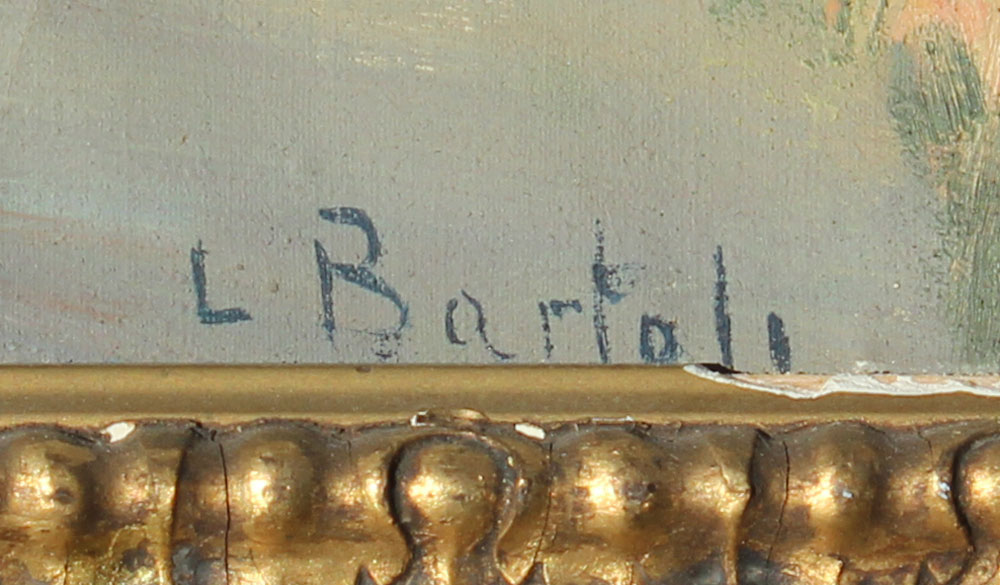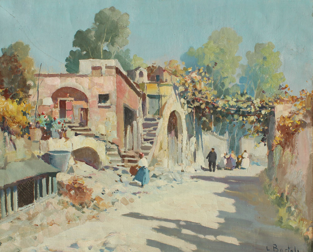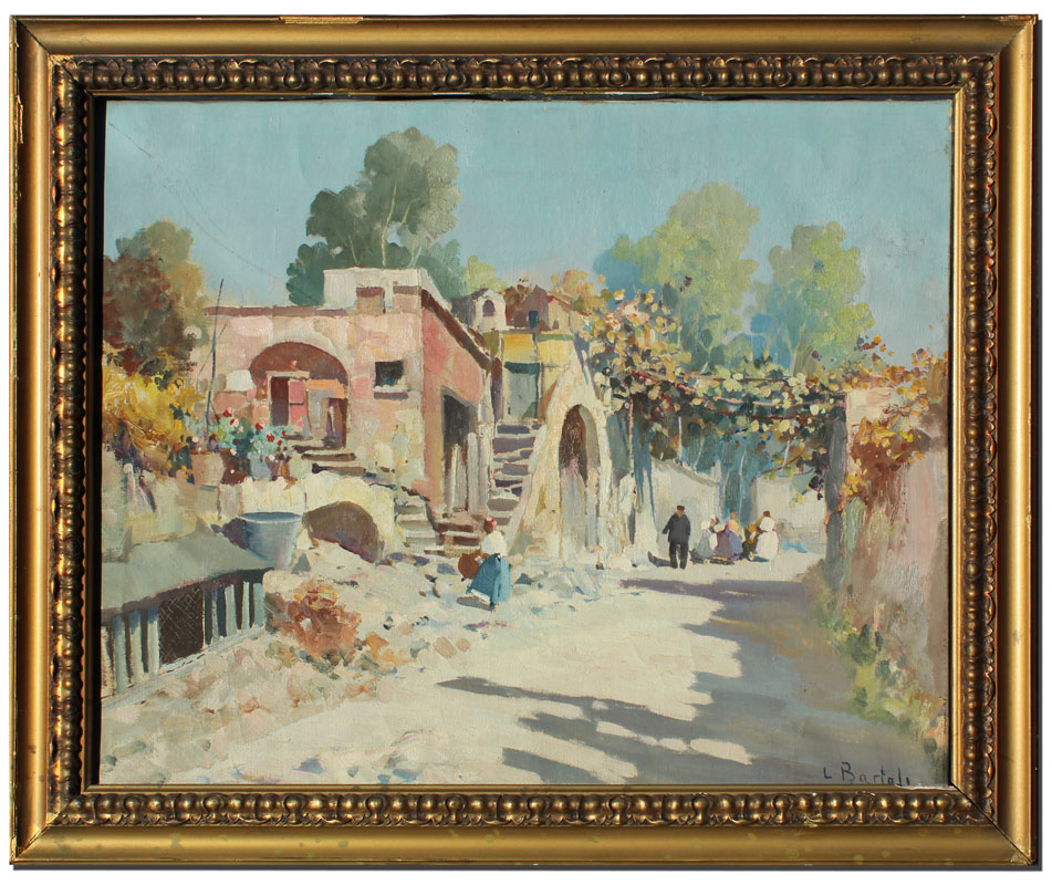 BARTOLI, L., (Italian, 20th C.): Italian Village Street Scene with Figures, OIL/Canvas, 15 1/2'' x 19 1/2'', signed lower left, encased in gilded liner with wear and overpaint, 19'' x 23''.