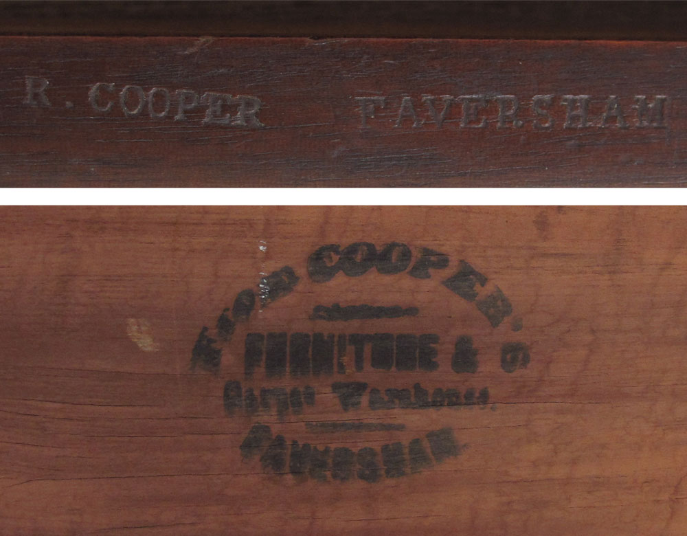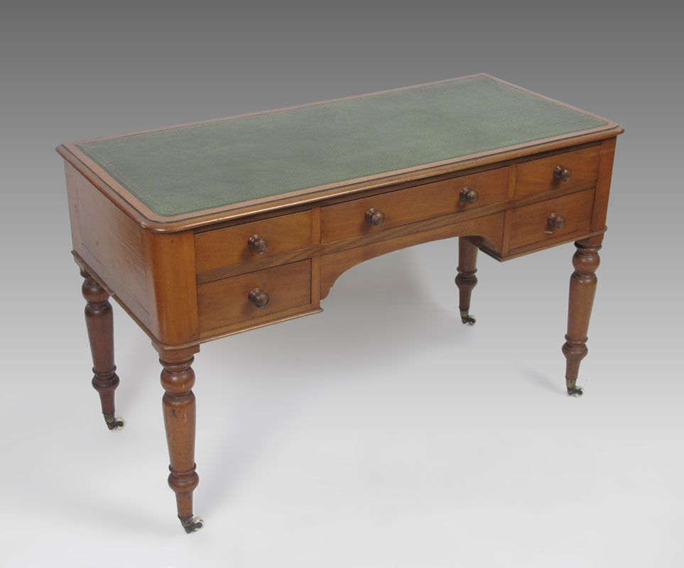 ENGLISH MAHOGANY WRITING TABLE: By Cooper of Febersham England, embossed green leather top with 5 drawers, on turned legs with castors. 30'' h. x 48 1/2'' x 21 1/2''.