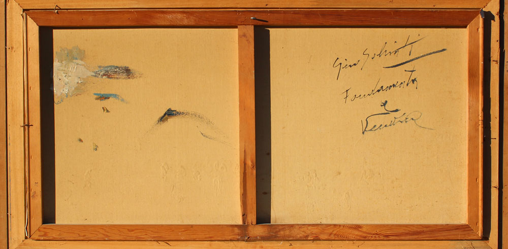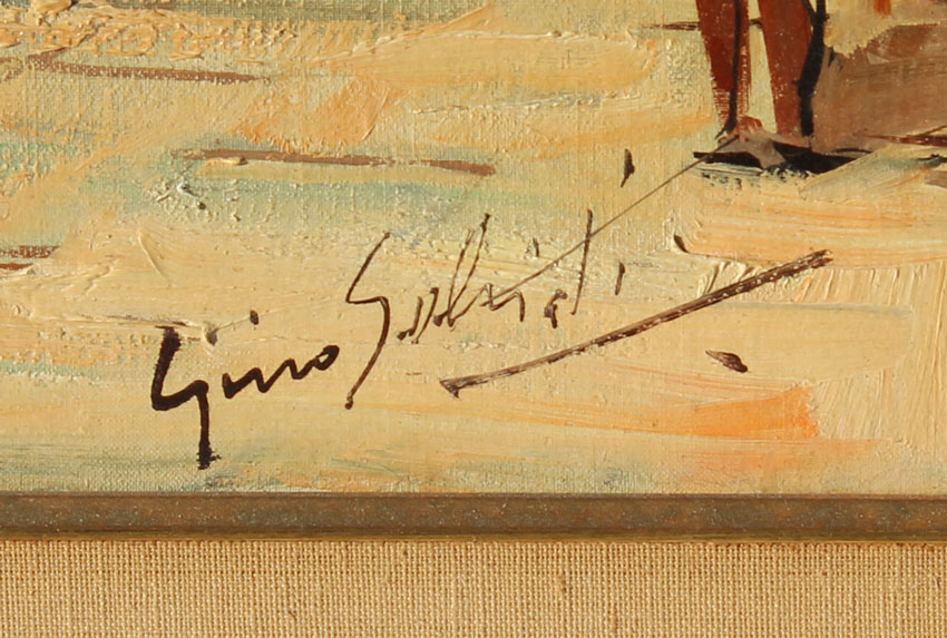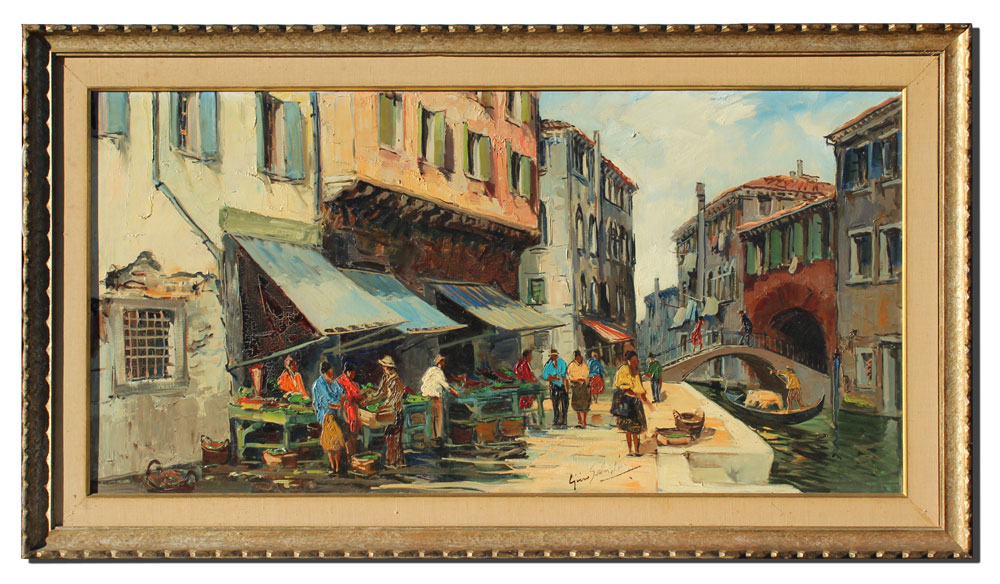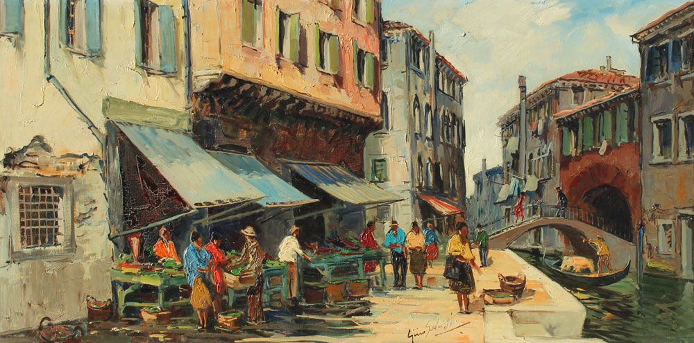 SALVIATI, Gino, (Italian, 20th C.): Venetian Canal Scene with Figures, OIL/Canvas, 24'' x 48'', signed lower right, signed and titled verso, framed, 31'' x 55''.