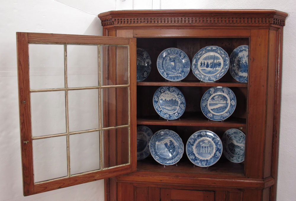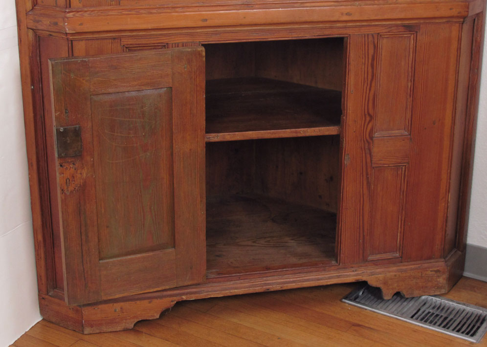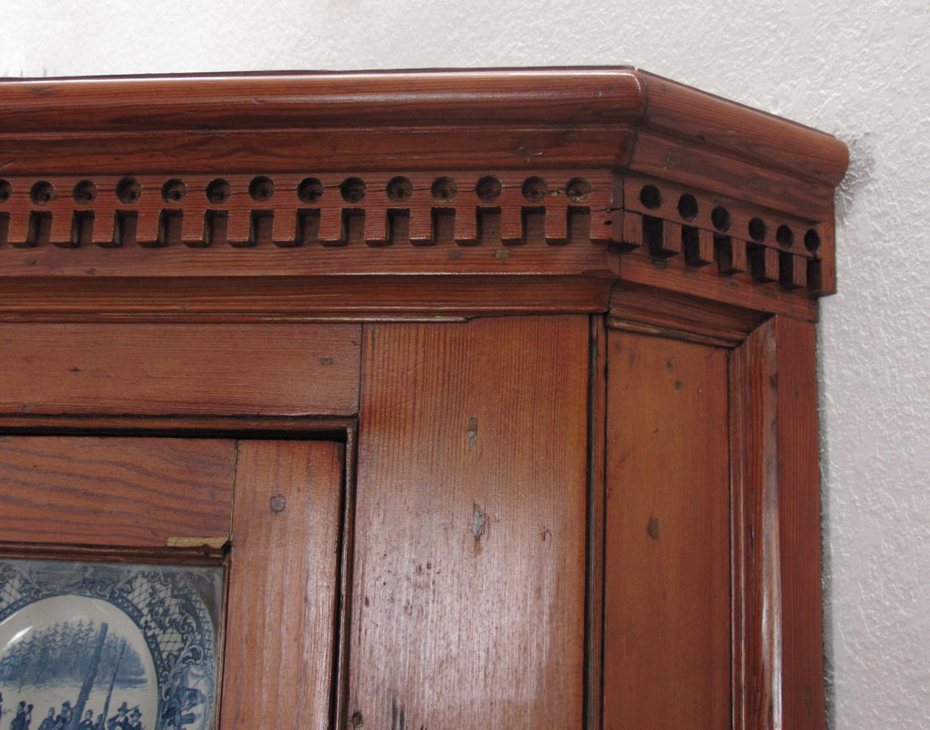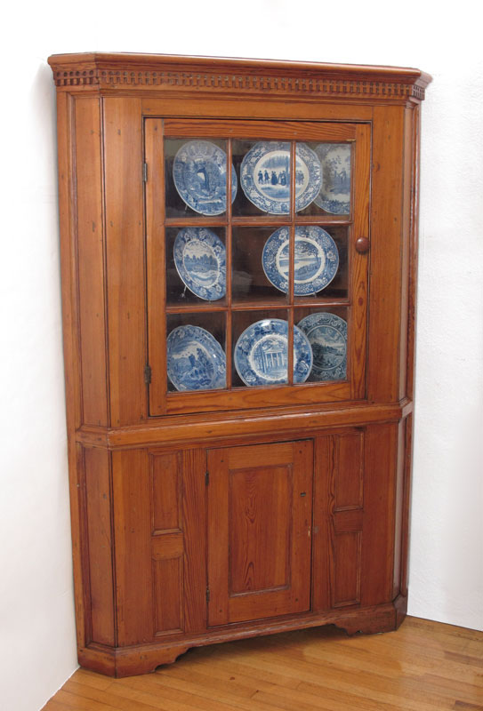 AMERICAN COUNTRY PINE CORNER CUPBOARD: Dentil trim around upper molding, 9 light top door with 2 interior shelves. Base with central door and single interior shelf. 75 1/4'' h. x 50'' x 13 1/4''.