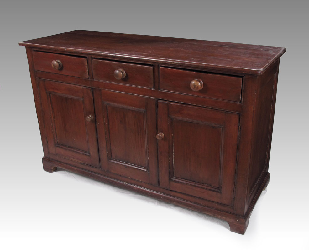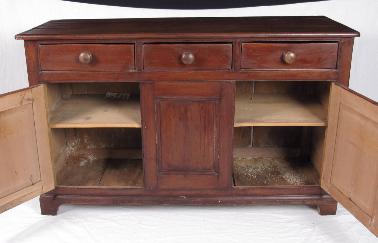 CA. 1840 ENGLISH COUNTRY DRESSER OR HUTCH BASE: 3 drawers over 2 doors flanking center fixed panel, beech and mixed woods. 36 1/2''h x 60'' x 21'' deep.