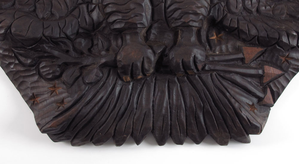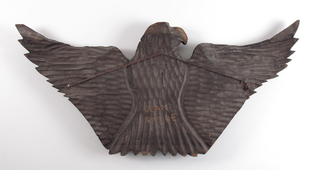 FOLK ART CARVED EAGLE SIGNED JEAN ANDRE: Nice carved folk art eagle wall hanging. Signed Jean Andre on back. 19'' x 40 1/2'' x 2 3/4''.