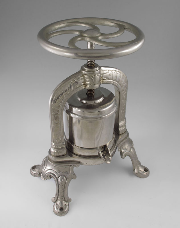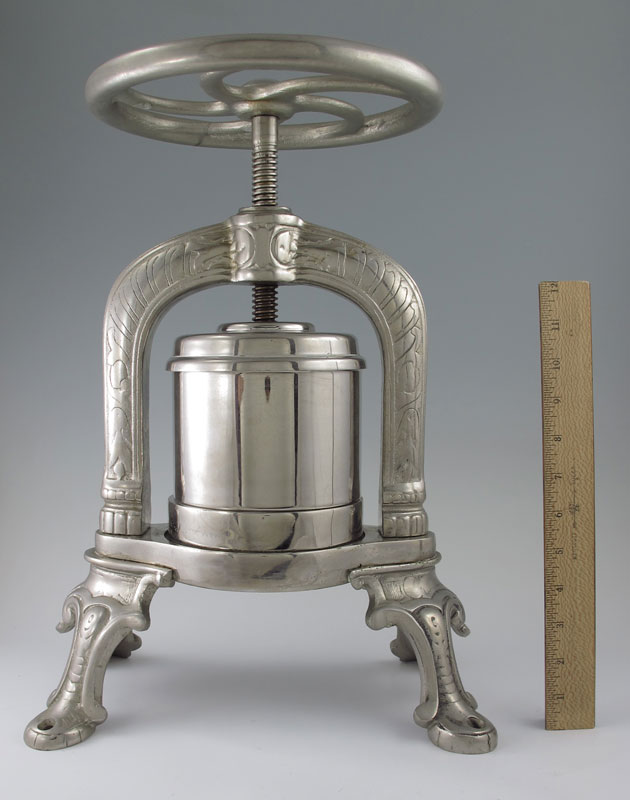 19TH CENTURY FRENCH SILVERED DUCK PRESS: Used for table side sauce preparation. Heavy cast iron frame on 4 feet with silvered finish. 16 3/4'' h. x 12 1/2'' x 8 1/2''.