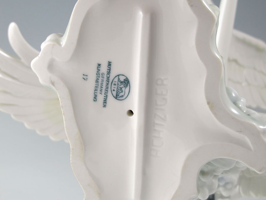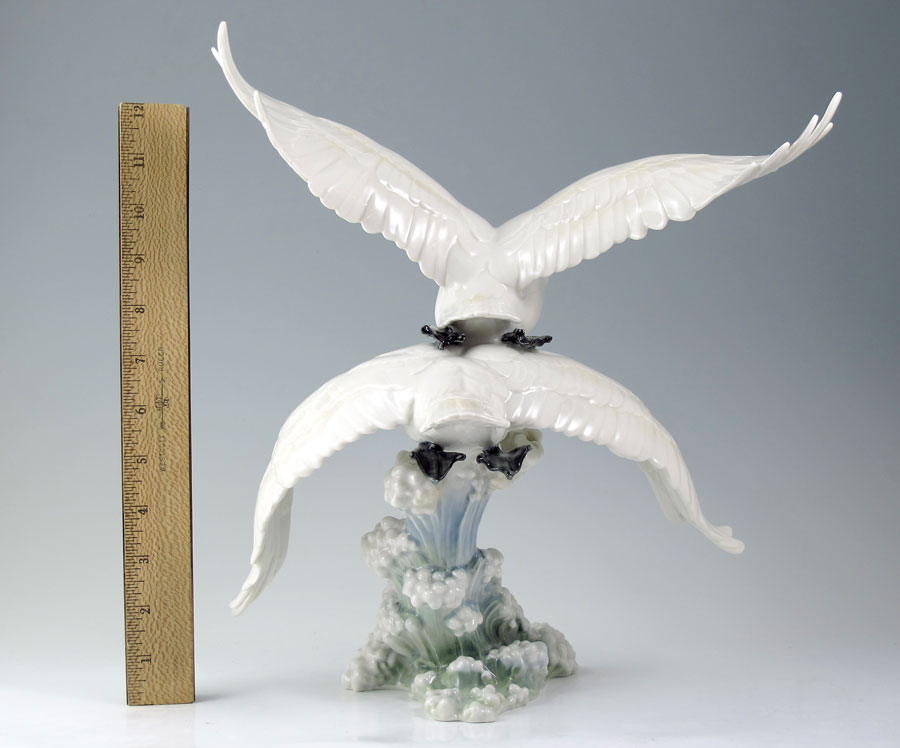 HUTSCHENREUTHER PORCELAIN MODEL OF TWO SNOW GEESE IN FLIGHT: A graceful study of geese in flight over the waters waves. Sculptor was Achtziger. 13 1/2'' x 11'' x 13''.