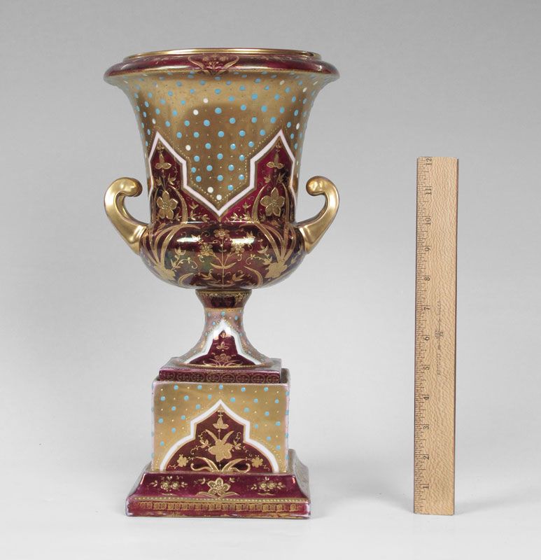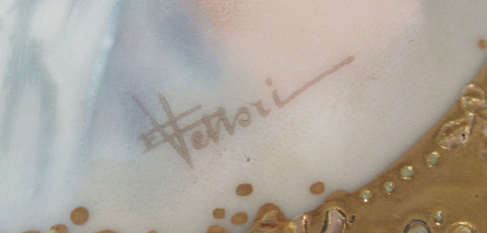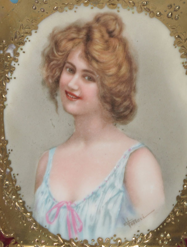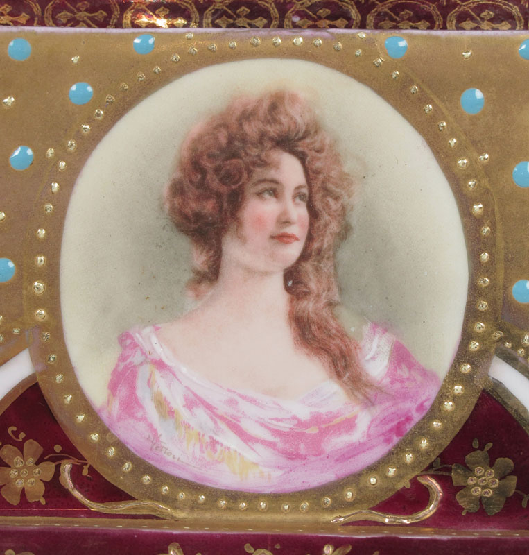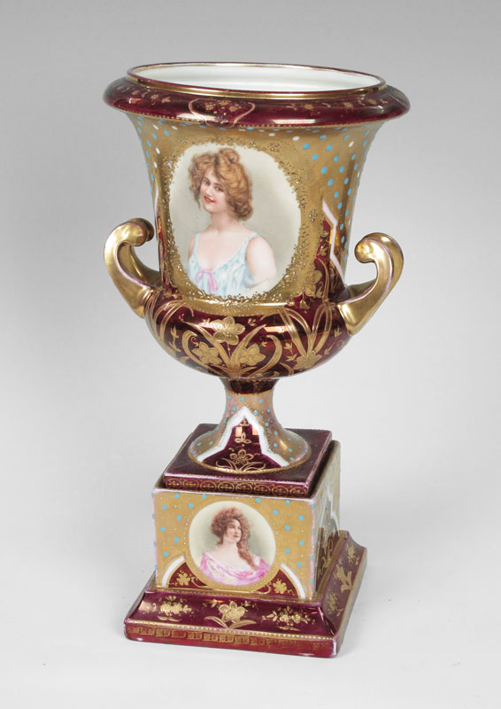 ROYAL VIENNA PORCELAIN PORTRAIT URN: Featuring portraits of women of fashion, top signed Vettori. Gilt decoration with raised turquoise color dots. Blue underglaze mark with Austria, number 26. Measures 15 3/4'' h. x 8''.