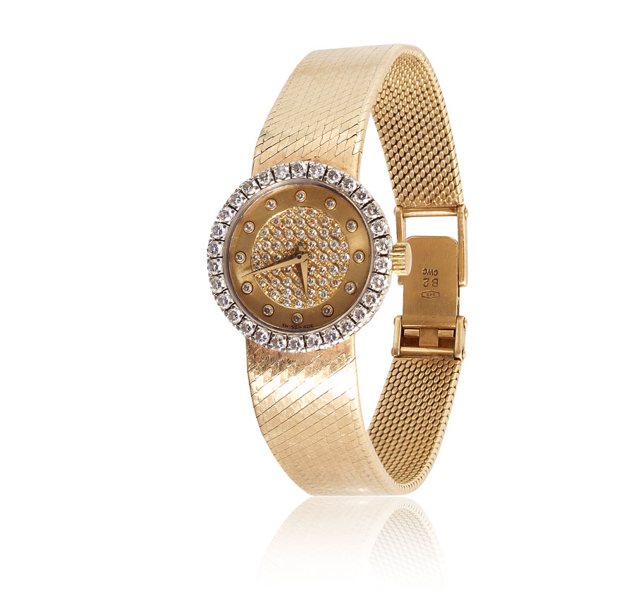 14K GOLD AND DIAMOND DRESS WATCH: 14K yellow gold case and integrated mesh band. Swiss made quartz movement in working order. Diamond bezel and diamonds in the field of the dial total approx. 1 Ct. Serial number on the case is 915943 and 215225. Length 7.25''. Weight 38.5 grams (gross).