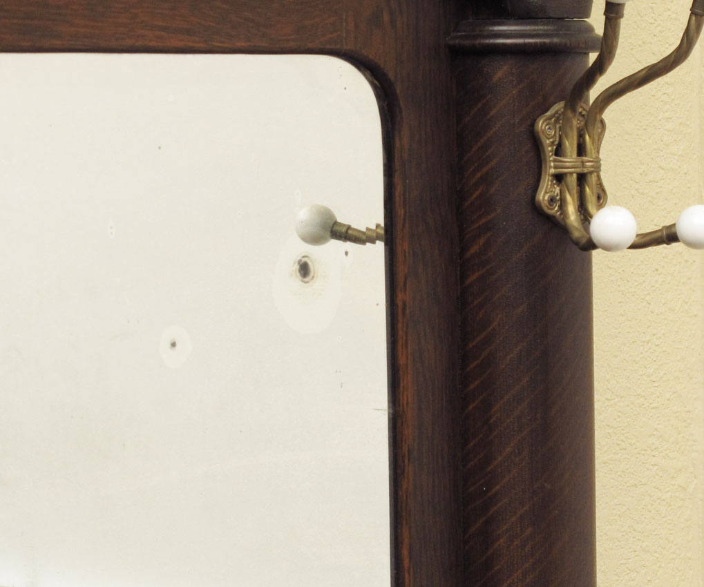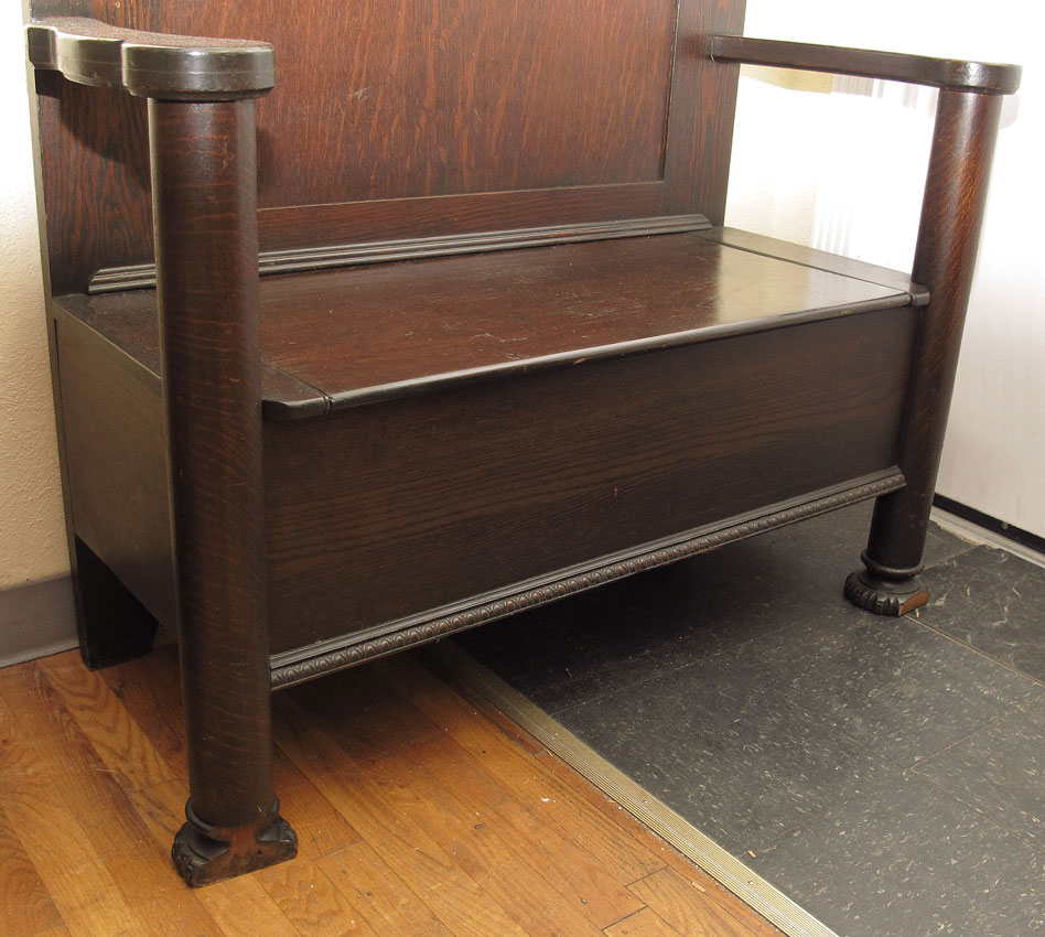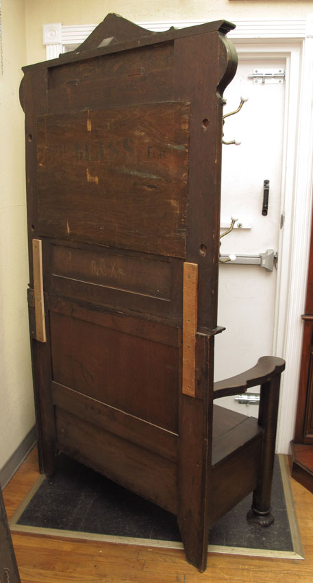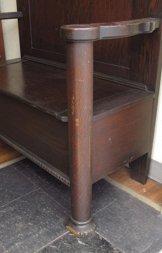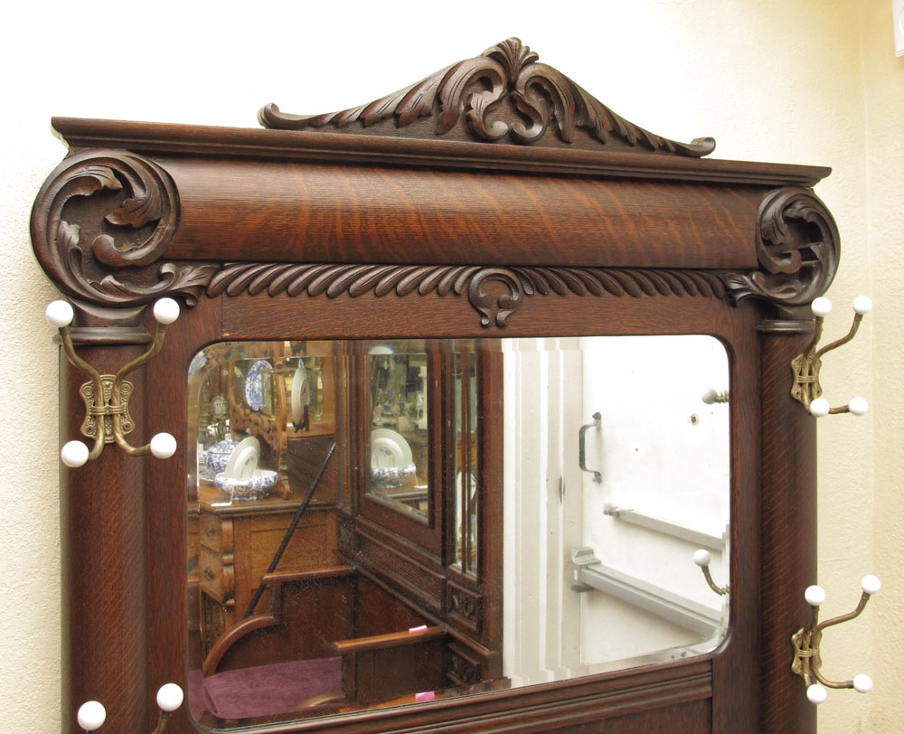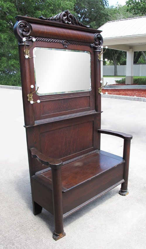 GOLDEN OAK HALL TREE: Carved crest over decorative carved foliate scroll, beveled glass mirror with 4 sets of hooks with porcelain balls, all over a bench seat with shaped arms, seat base lifts to reveal compartment. Carved front feet measures 80 1/2'' h., x 44'' x 19 1/2''.