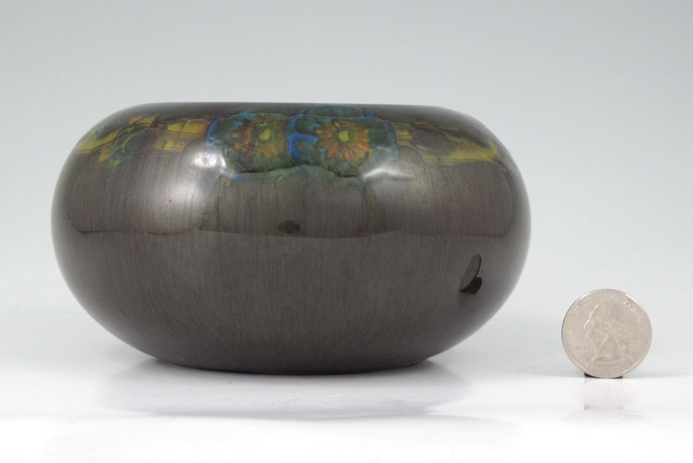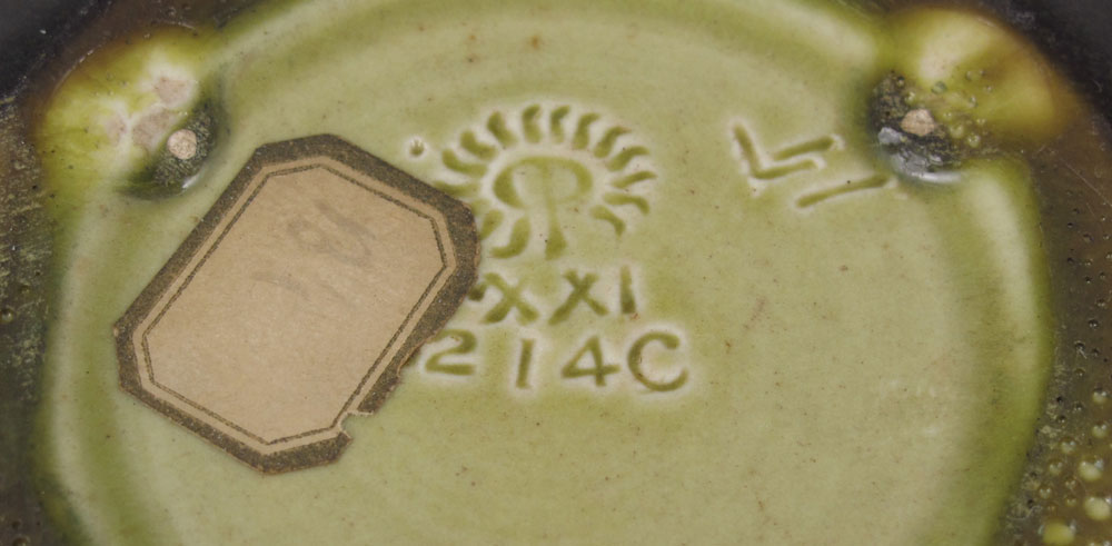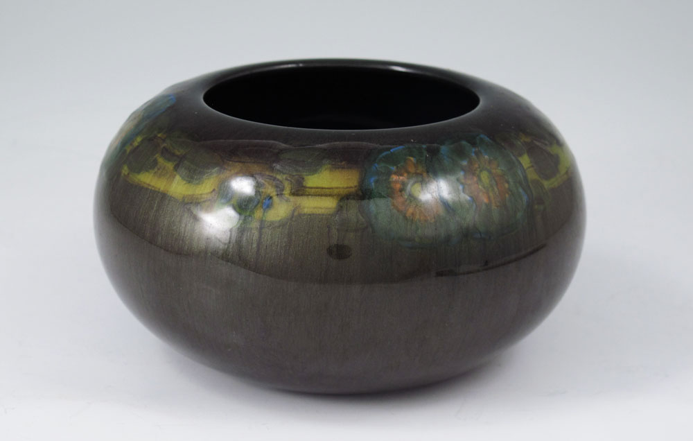 1921 ROOKWOOD POTTERY LORINDA EPPLY 214C BOWL: Ring with stylized pansies over olive green glaze, deep blue interior. Impressed Rookwood mark, 1921 date mark, Lorinda Epply artist mark. 2 3/4'' h. x 5 1/4''.