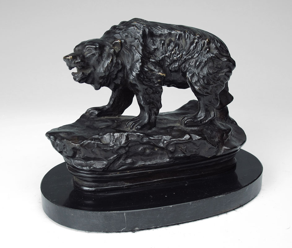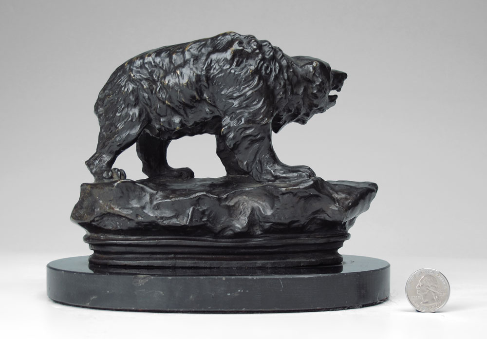 GROWLING BEAR BRONZE: He has significant age, 5 1/2'' h. x 7 1/4'' w., sits on a marble plinth, 6'' x 8''.