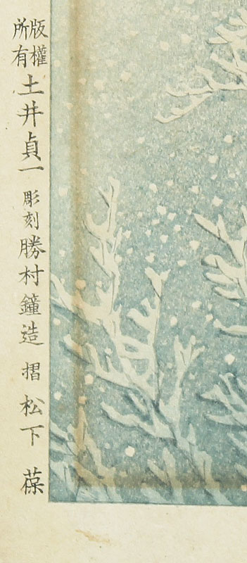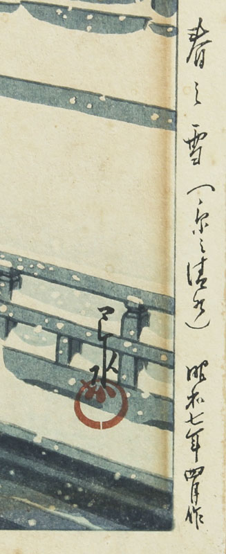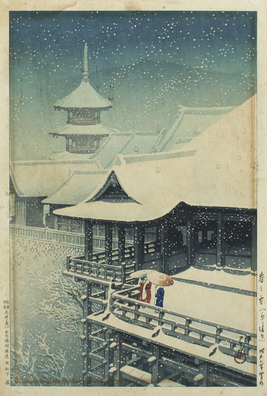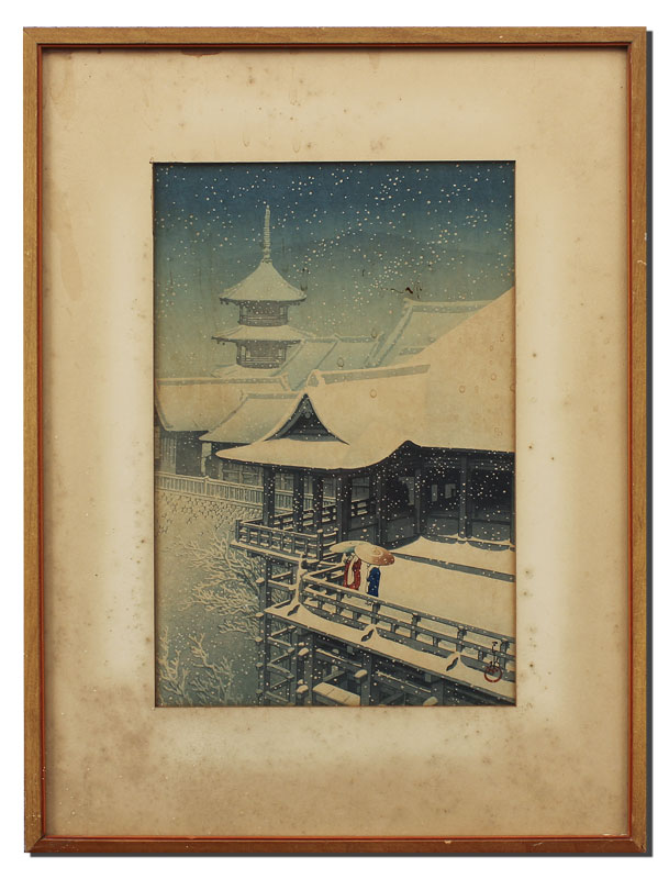 HASUI, Kawase, (Japanese, 1883-1957): ''Spring Snow at Kiyomizu Temple, Kyoto'', Woodblock, size with margins 15 1/4'' x 10 3/8'', markings to both lower left and right margins, published in 1932, framed 21 1/4'' x 16''.