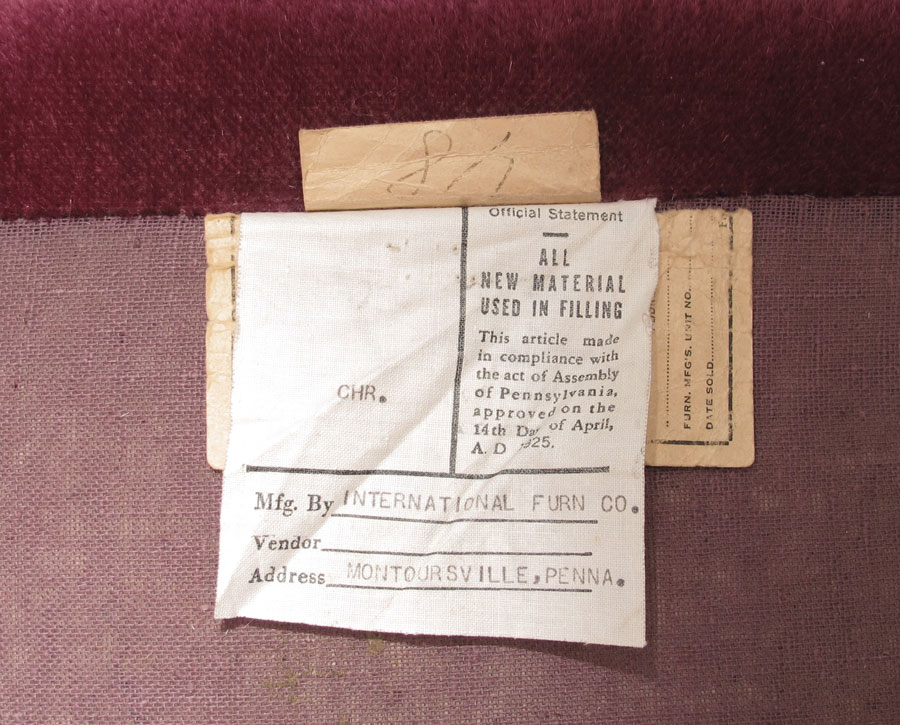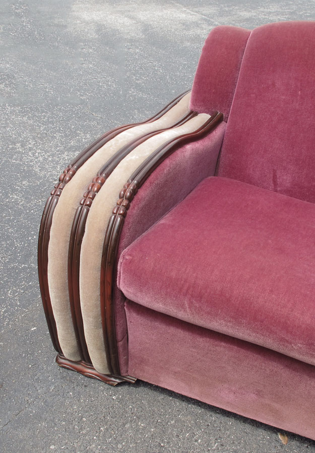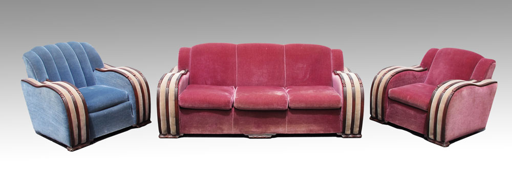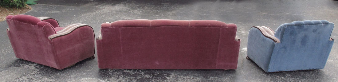 ART DECO MOHAIR SOFA AND 2 CHAIRS: International Furniture Co. and Joan Plush Mills Label. Overstuffed 3 cushion sofa and chairs with dramatic rolled arms typical in the 1930's. All original. Sofa is 32'' h. x 80'' l. x 39'' w. , chair 32'' h. x 38'' x 38''.