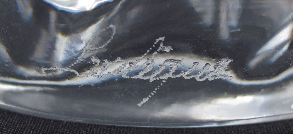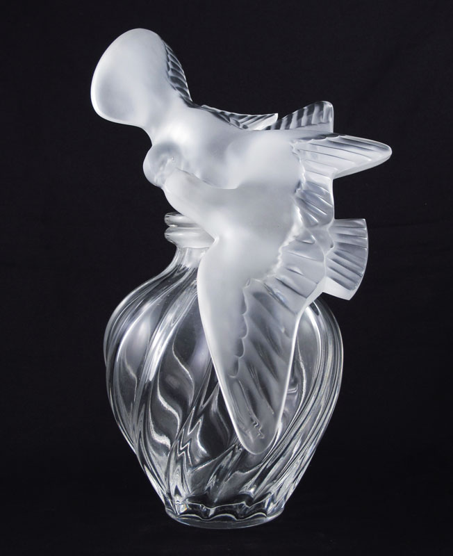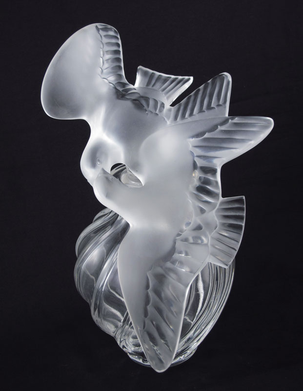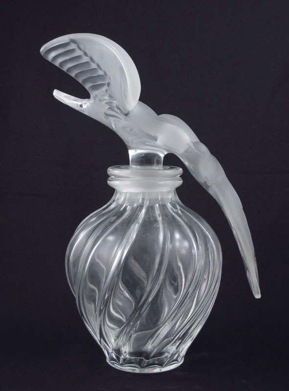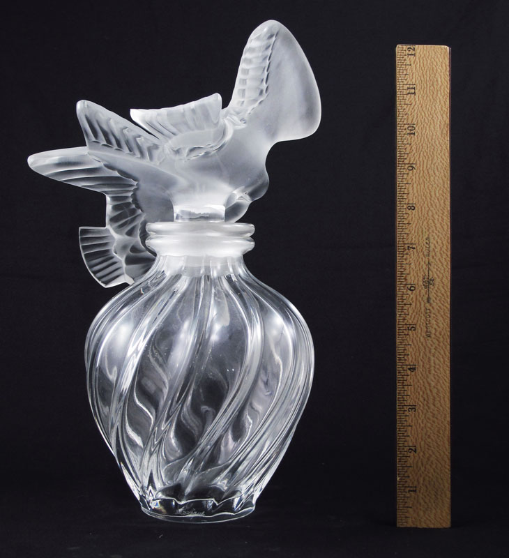 LALIQUE L'AIR DU TEMPS PERFUME FACTICE BOTTLE: Lalique for Nina Ricci, featuring 2 frosted and clear figural conjoined doves stopper and right twist body. Engraved Lalique. Examples of this bottle date as early as the 1920's. Overall 12 1/2'' h. x 7 1/2''. See matching bottle next lot.