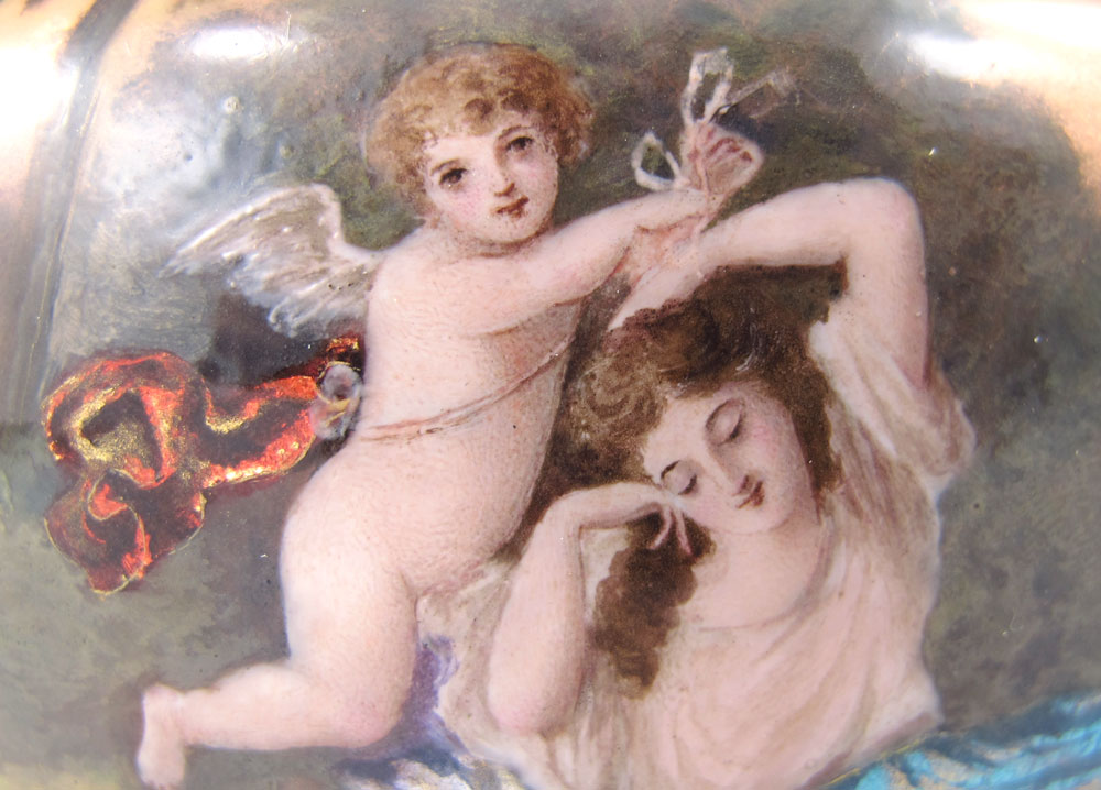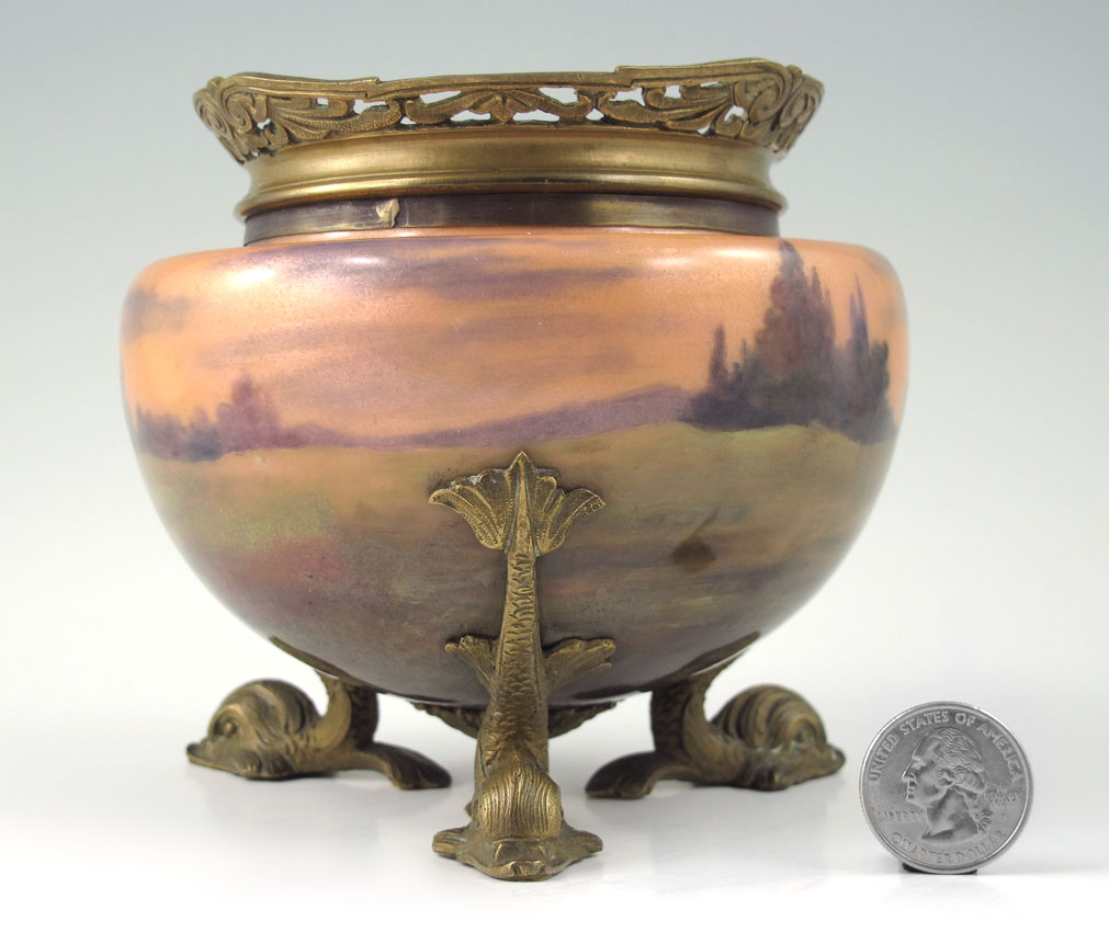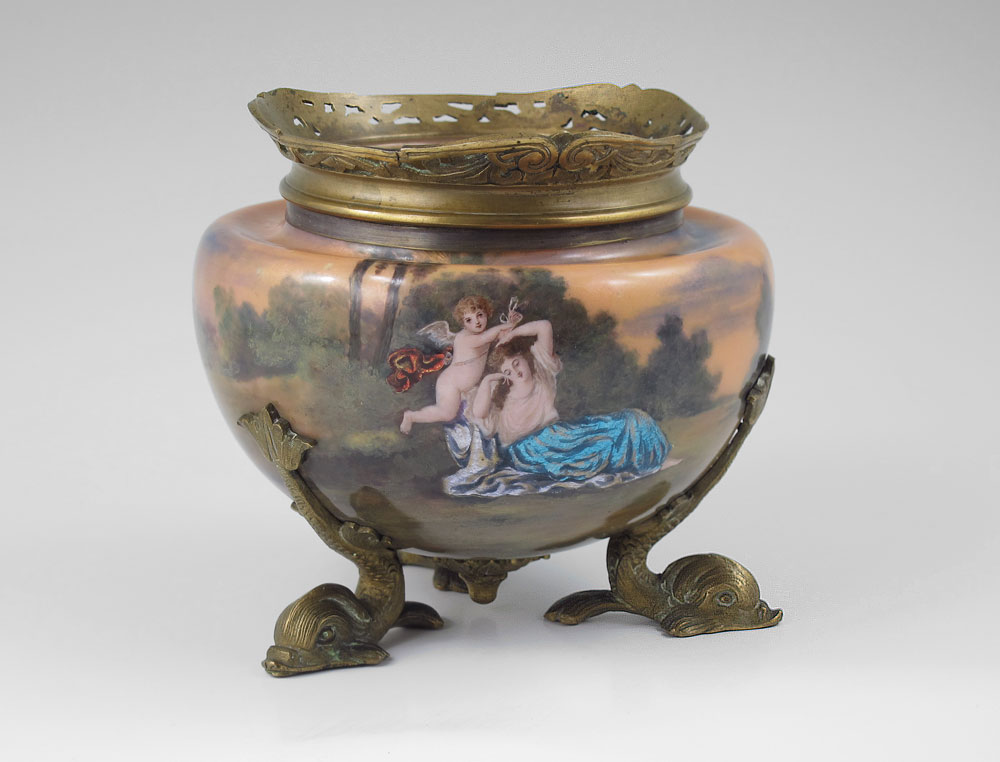 FRENCH ENAMEL JARDINIERE: Scenic landscape with cupid and Venus. Mounted on a figural dolphin feet, metal lining. Measures 5'' x 5'' overall.