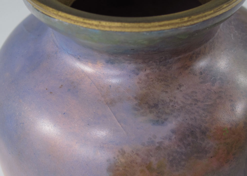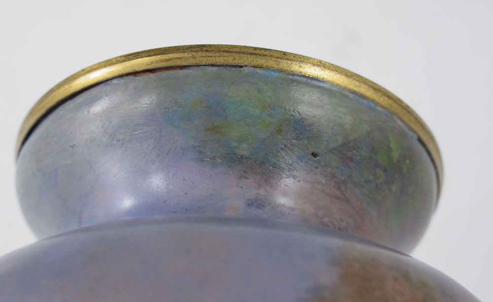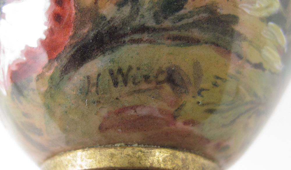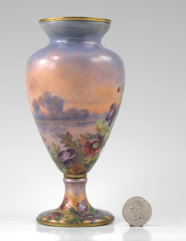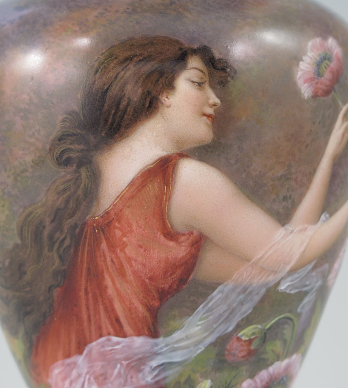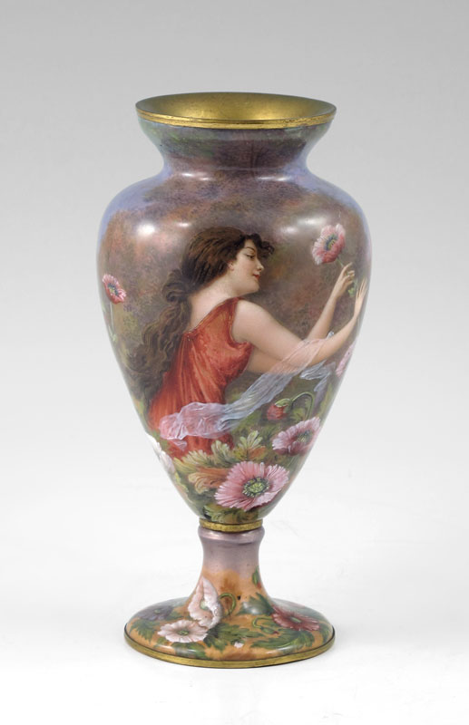 ARTIST SIGNED FRENCH ENAMEL VASE: Maiden with long flowing hair and sheer scarf, surrounded by poppies. Signed H. Winch (?), 6 3/4'' tall. Professional restoration along upper rim.