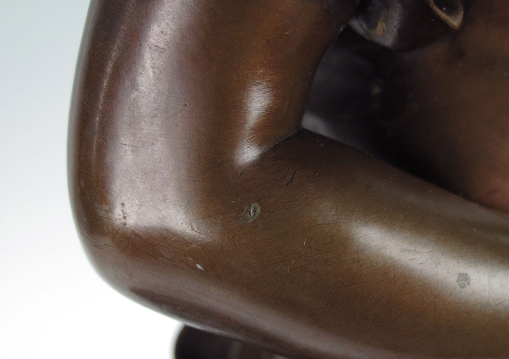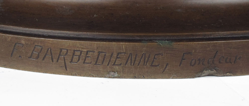 CONDITION: Some wear to patina and small amount of damage; the rim of her scarf above her eyebrow has been dented and cracked, visible upon close inspection.